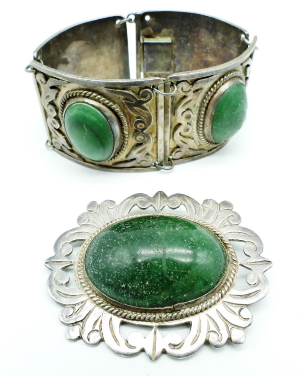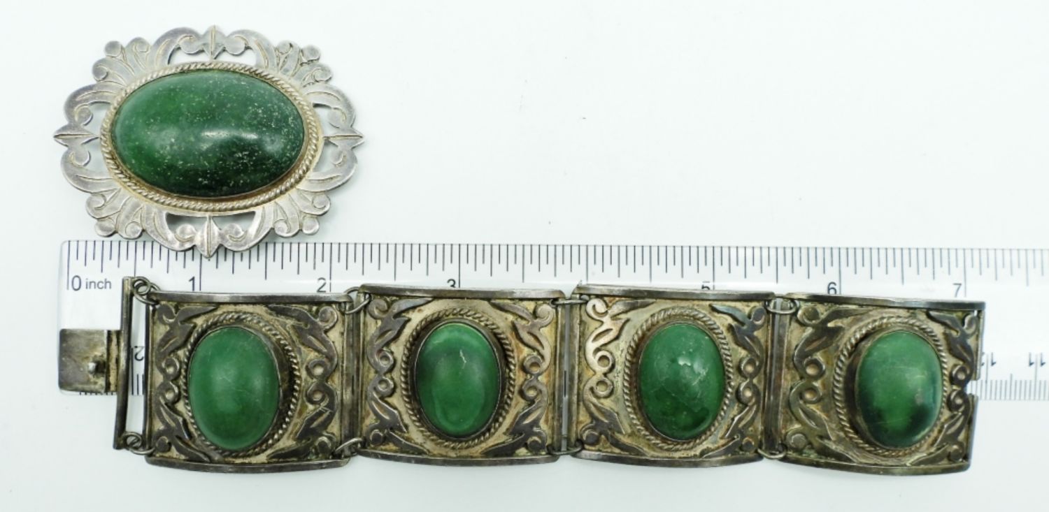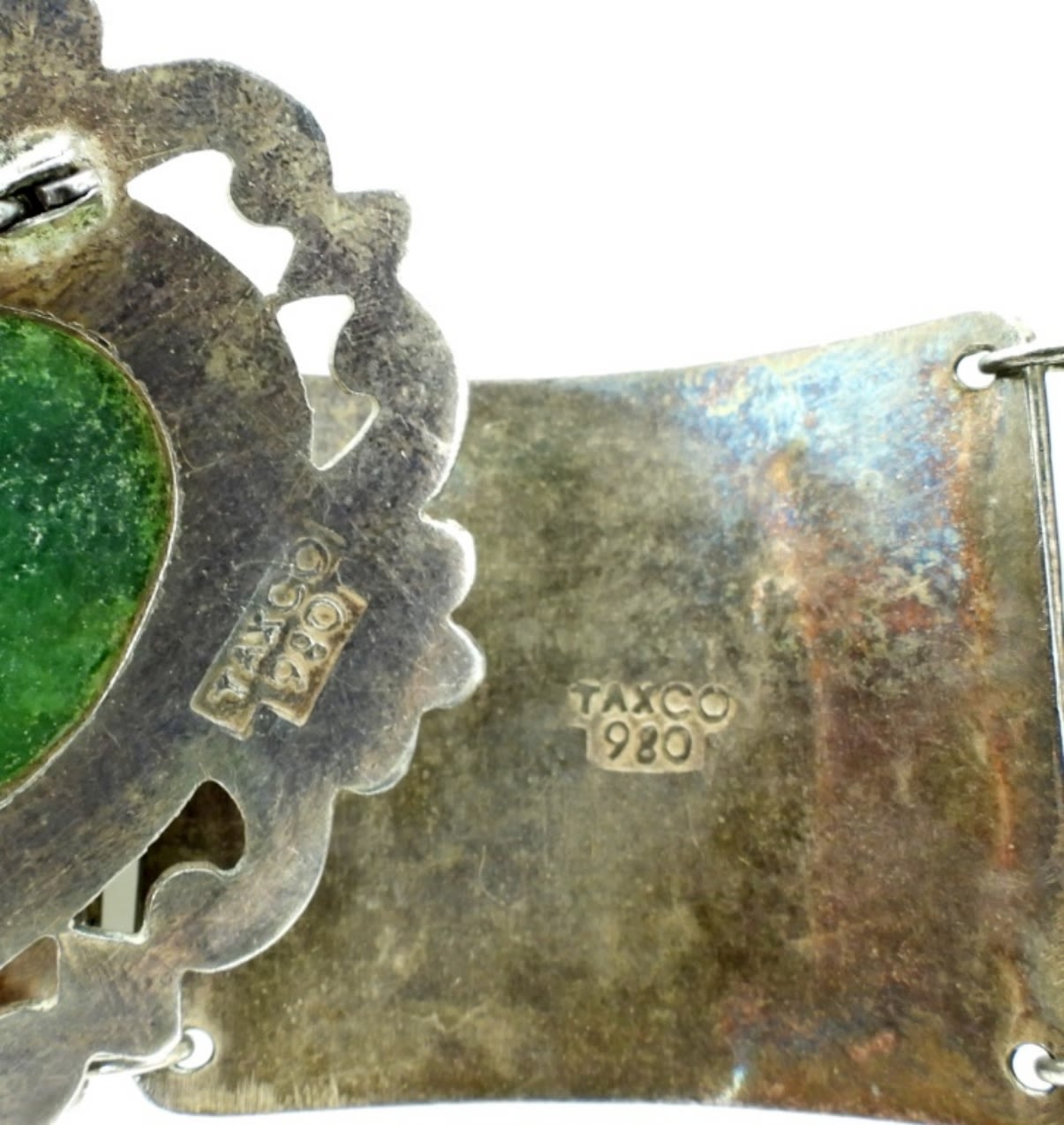 66.2DWT, 7 1/2″ LONG WITH BOX CLASP STAMPED 980 TAXCO ON THE BACK, 2 1/2″ FOR THE BROOCH, STAMPED TAXCO 980, UNQUIE PIECES