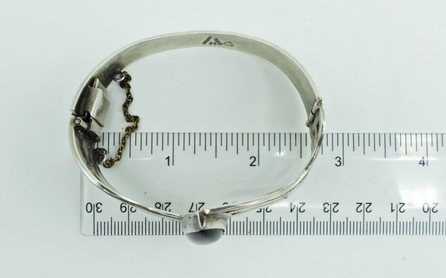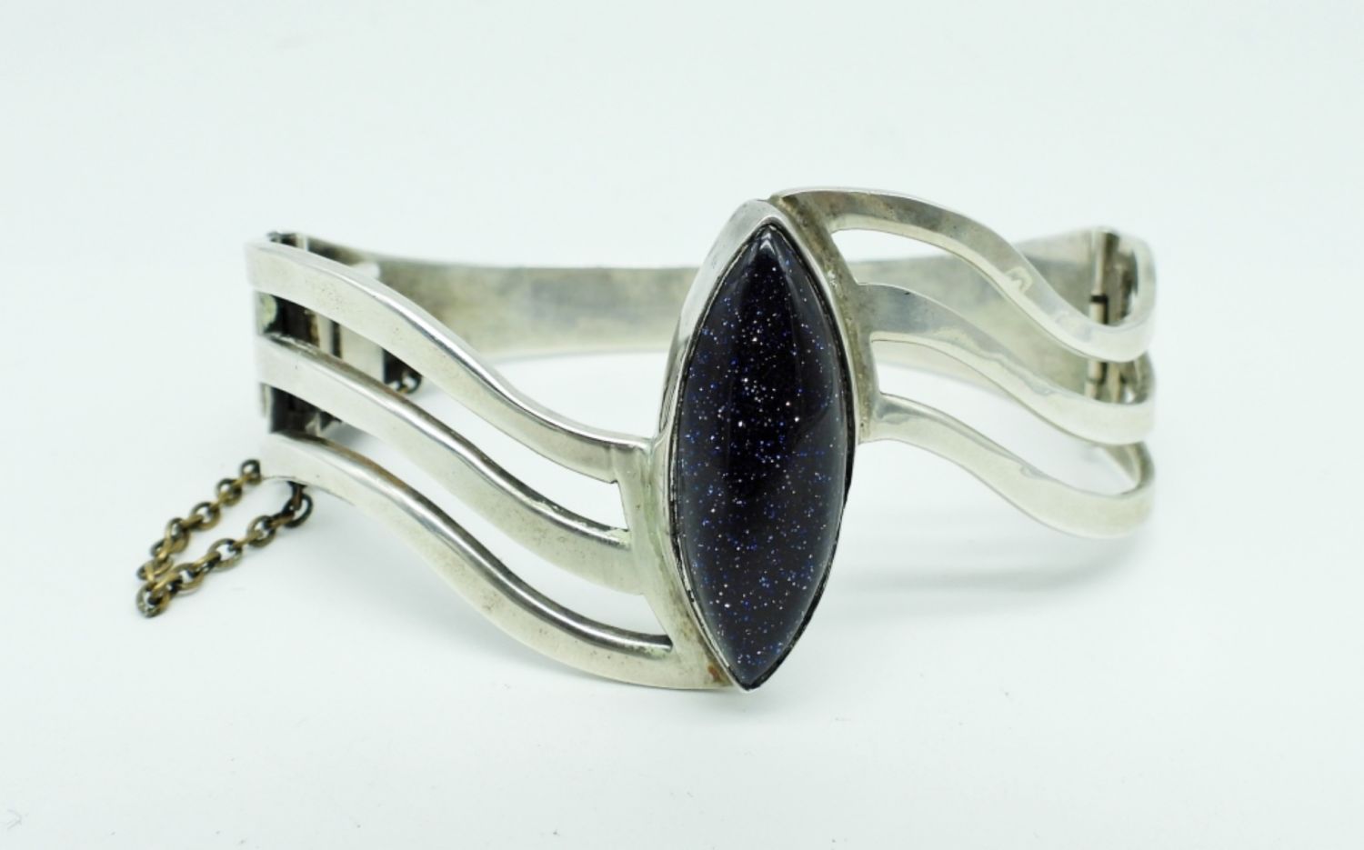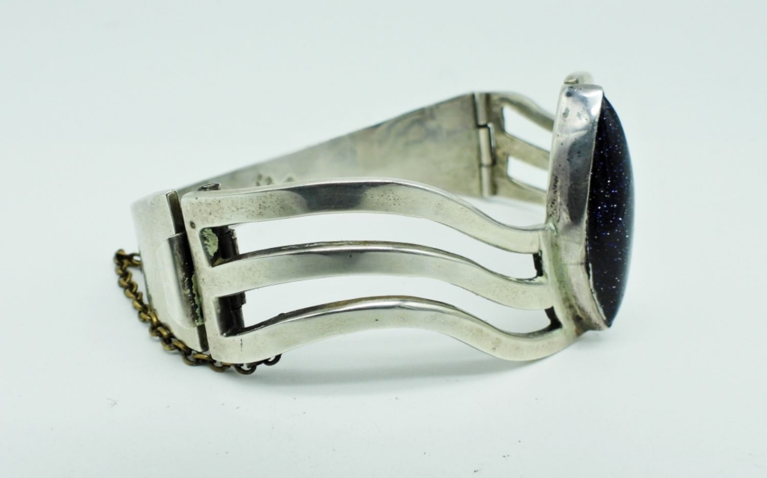 24DWT,2 1/2″WIDE. BLUE SUNSTONE IN THE MIDDLE, A HINGE BRACELET WITH BOX CLASP, STAMPED MEXICO 925