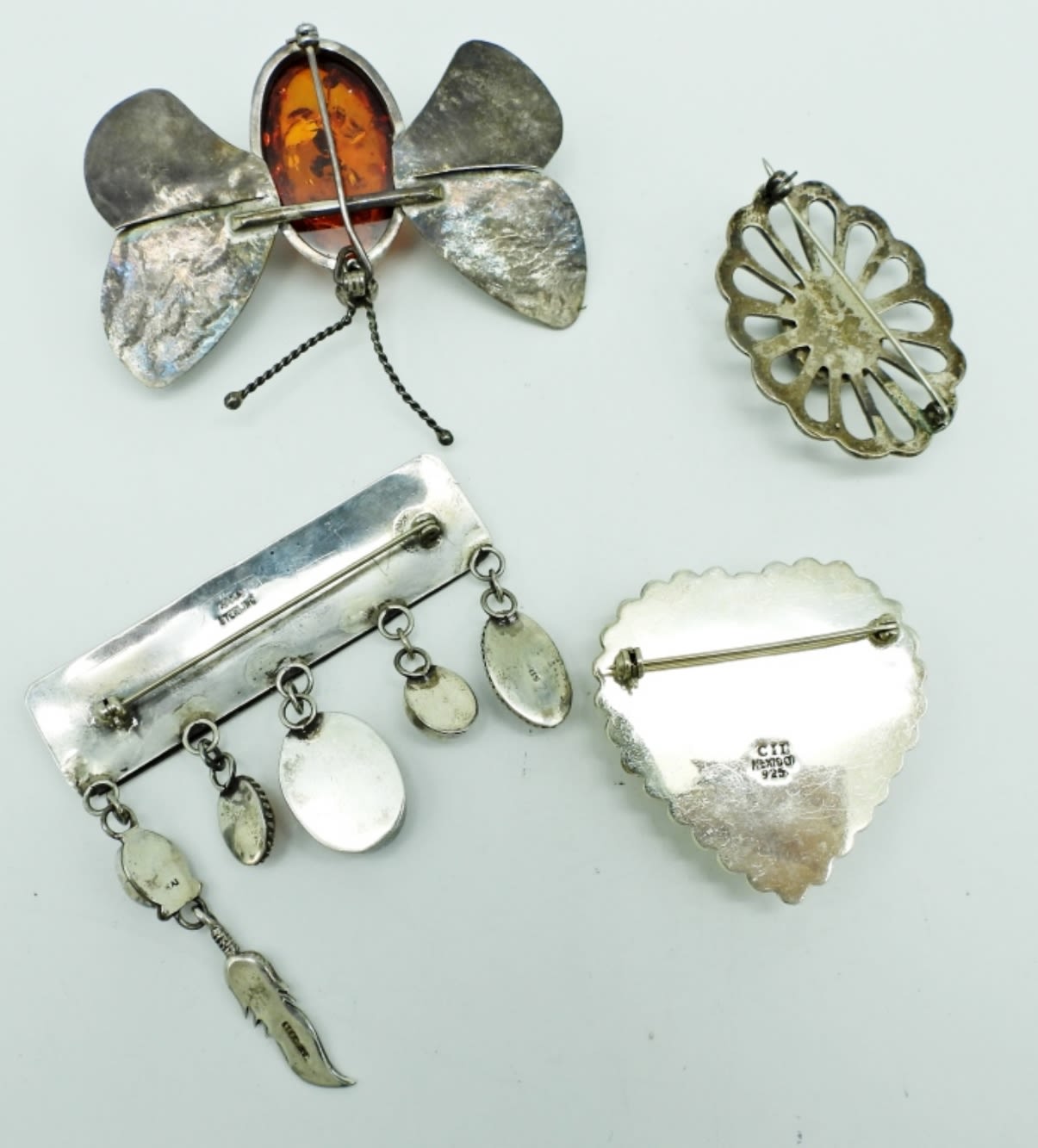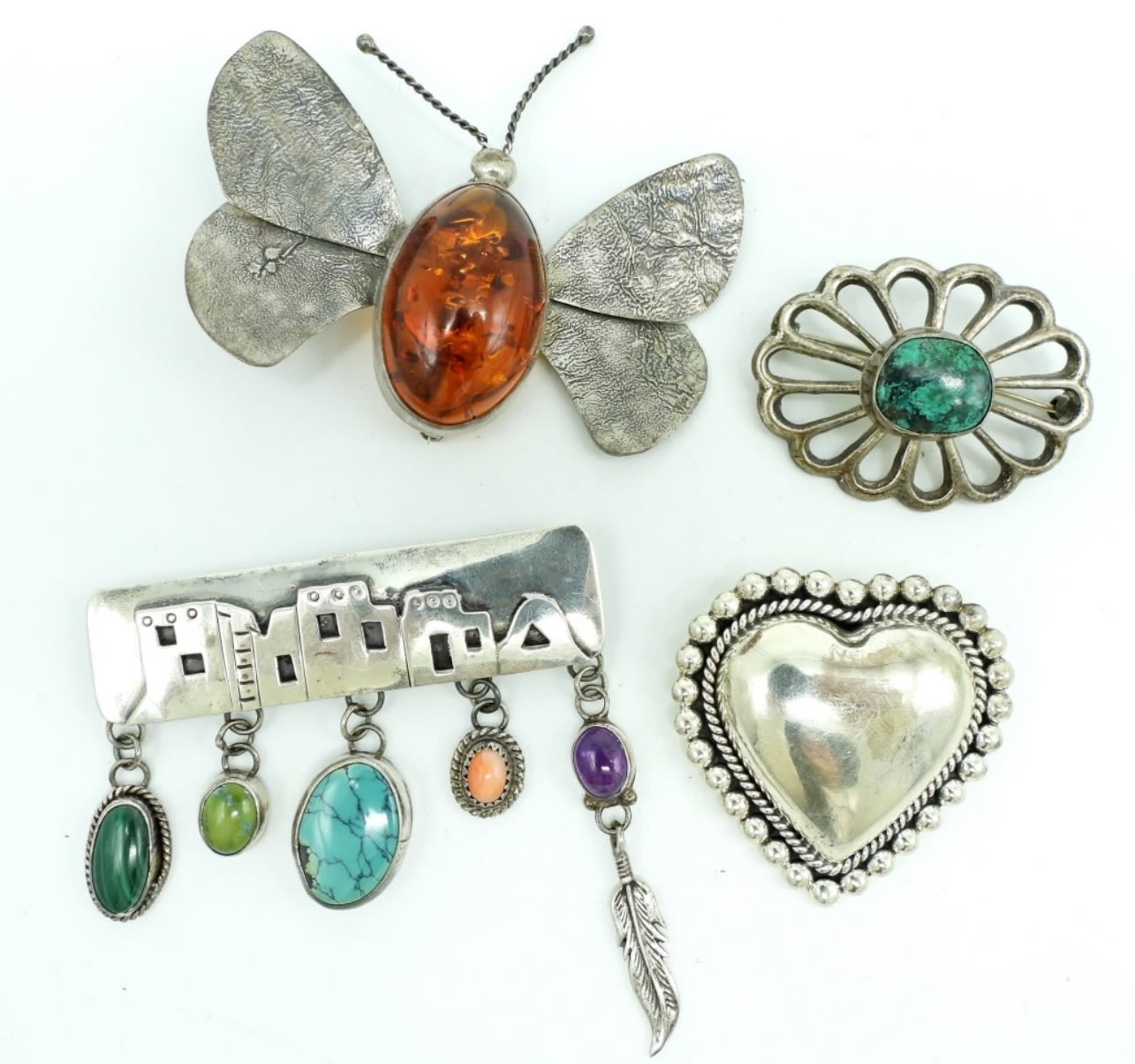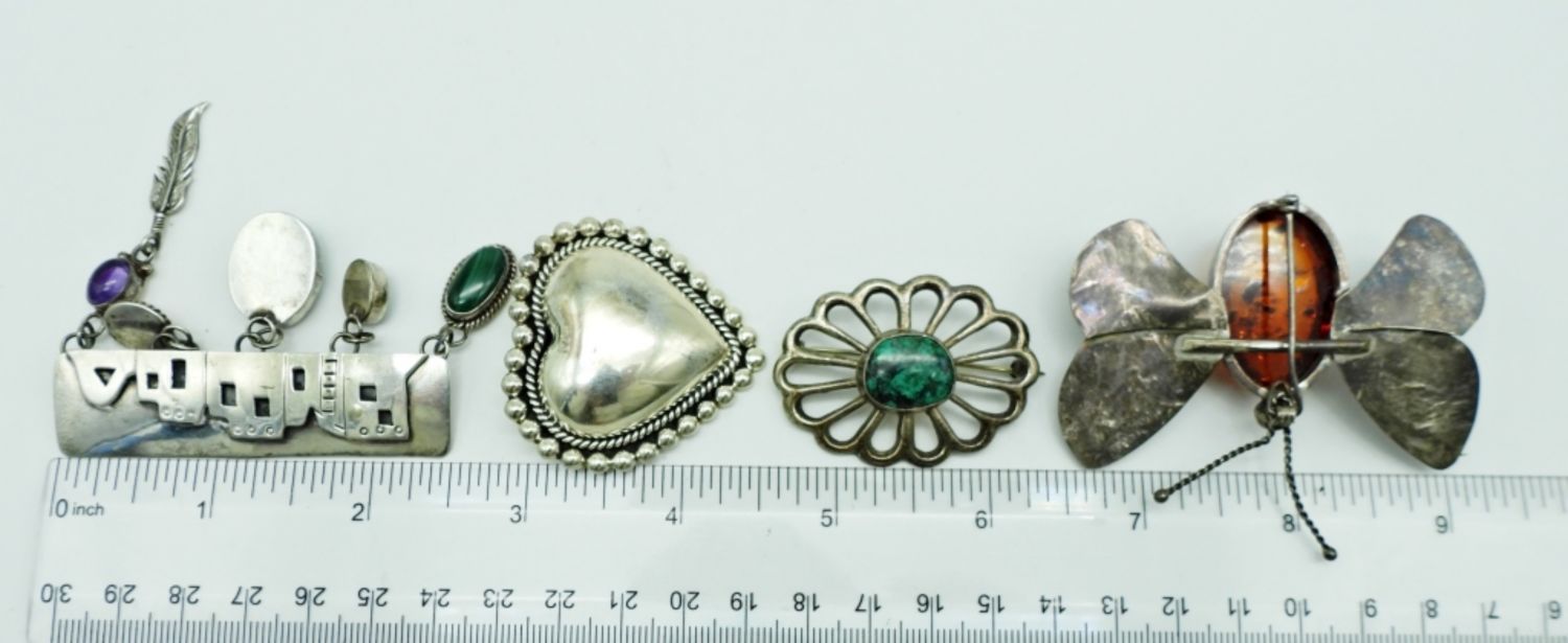 45.7DWT, 1- 2 1/2″ BUTTERFLY WITH AMBER STONE IN THE MIDDLE, NO STAMPING, 1- OVAL 2″ LONG (CLASP IS BROKEN FOR REPAIR), 1- 2″ LONG HEART STAMPED CII MEXICO 925, 1- 2 1/2″ VILLAGE WITH NATURAL STONES DANGLING, STAMPED NAKAI STERLING
