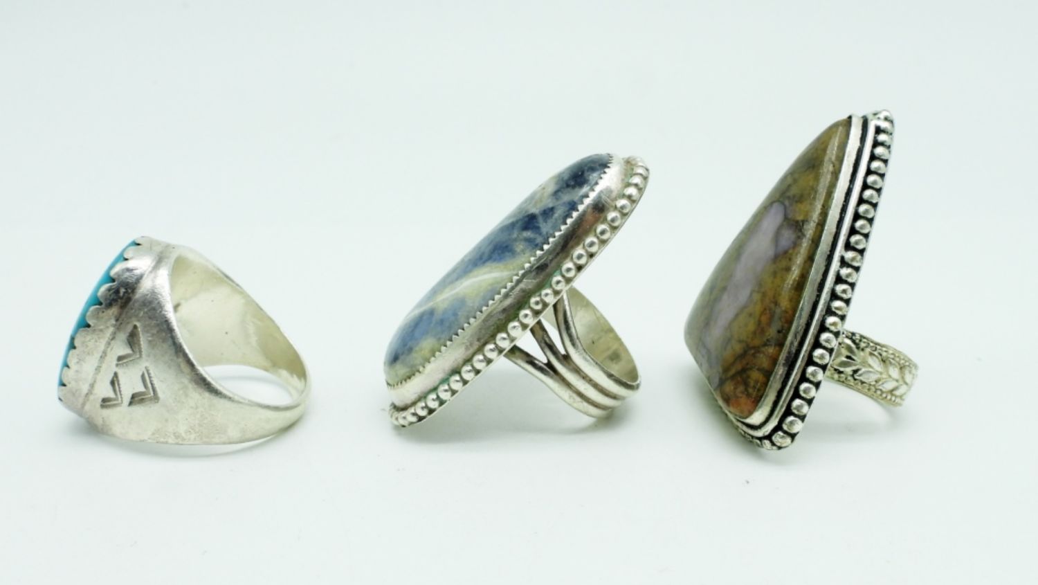 40DWT, DIFFERENT STYLES AND STONES, SIZES 8, 9, & 12, ONE STAMPED STERLING, ONE STAMPED 925, NO STAMPINGS FOUND ON THE OTHER