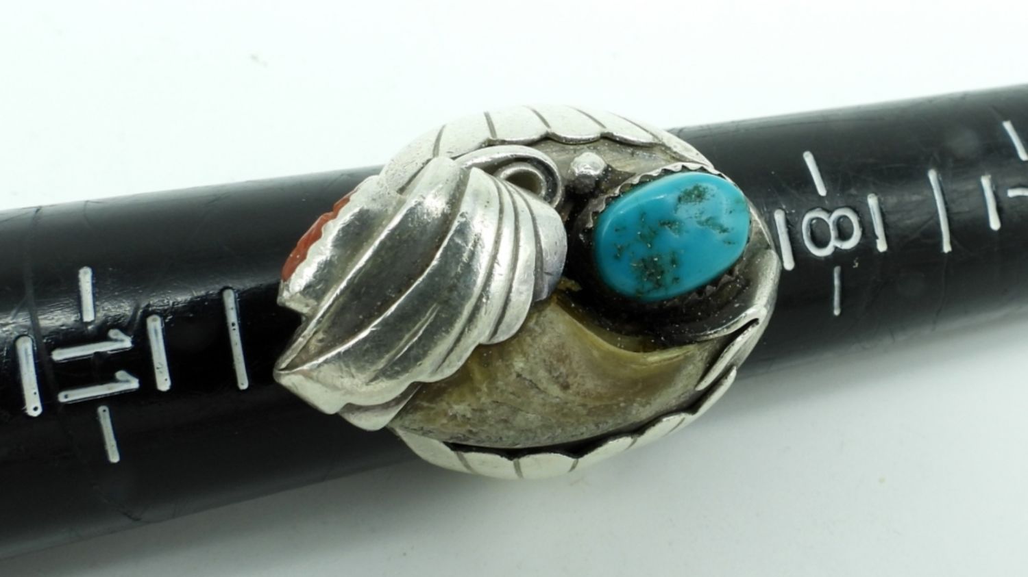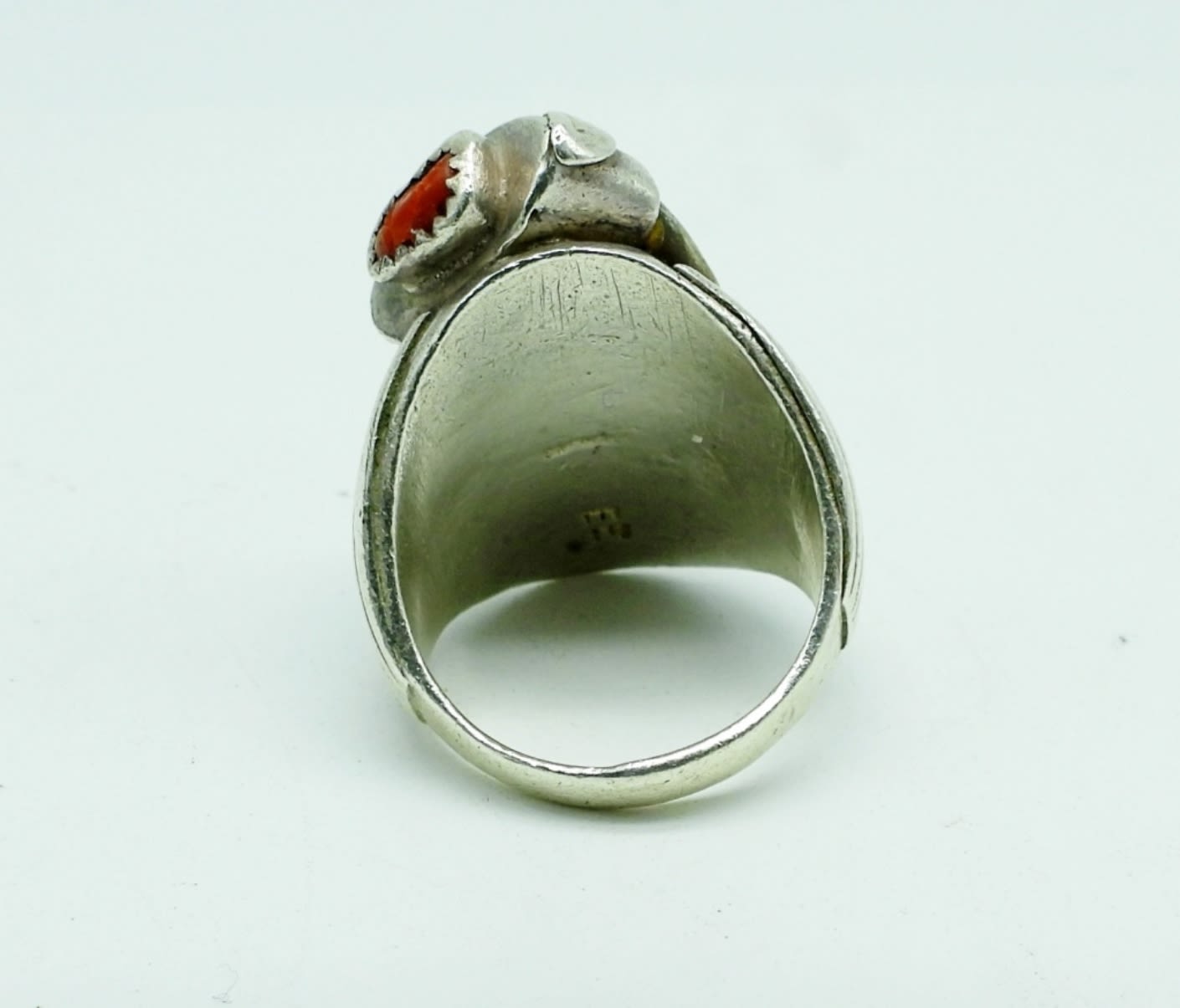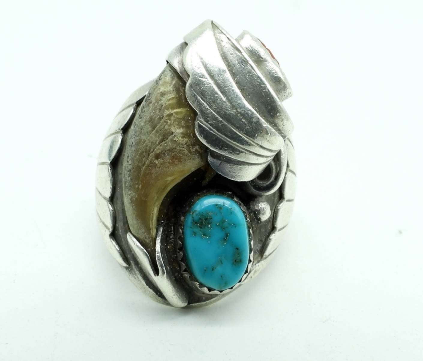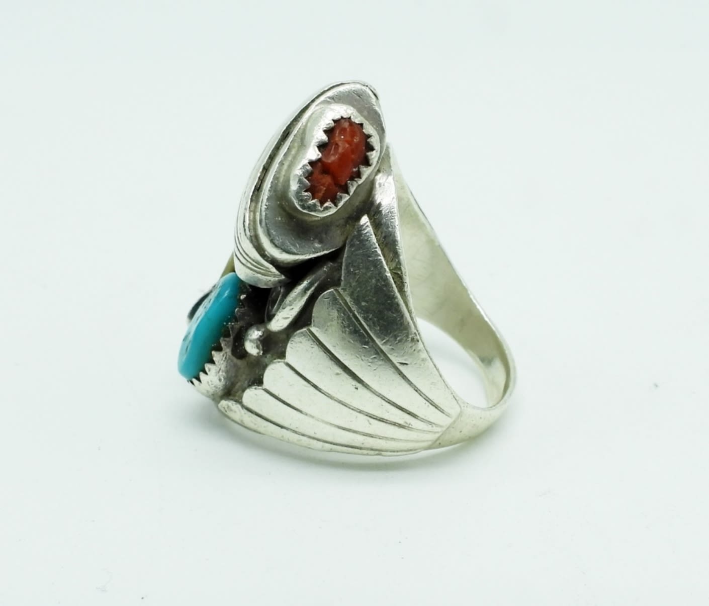 15DWT, 1- SZ 9 1/2, CLAW WITH TURQUOISE AND CORAL STONE, STAMPED STERLING “EE”