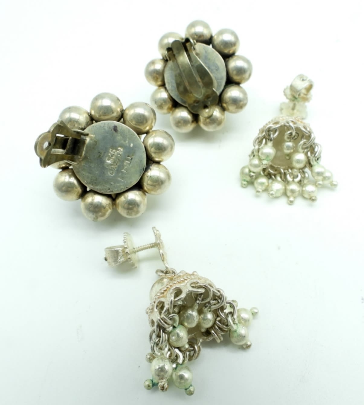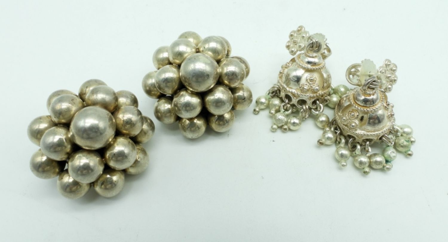 33DWT, 1 PAIR IS CLIP-ON WITH STERLING BALLS STAMPED TR-121 MEXICO 925, 1 PAIR VINTAGE SCREW BACK PIERCED DANGLES, NO STAMPING FOUND