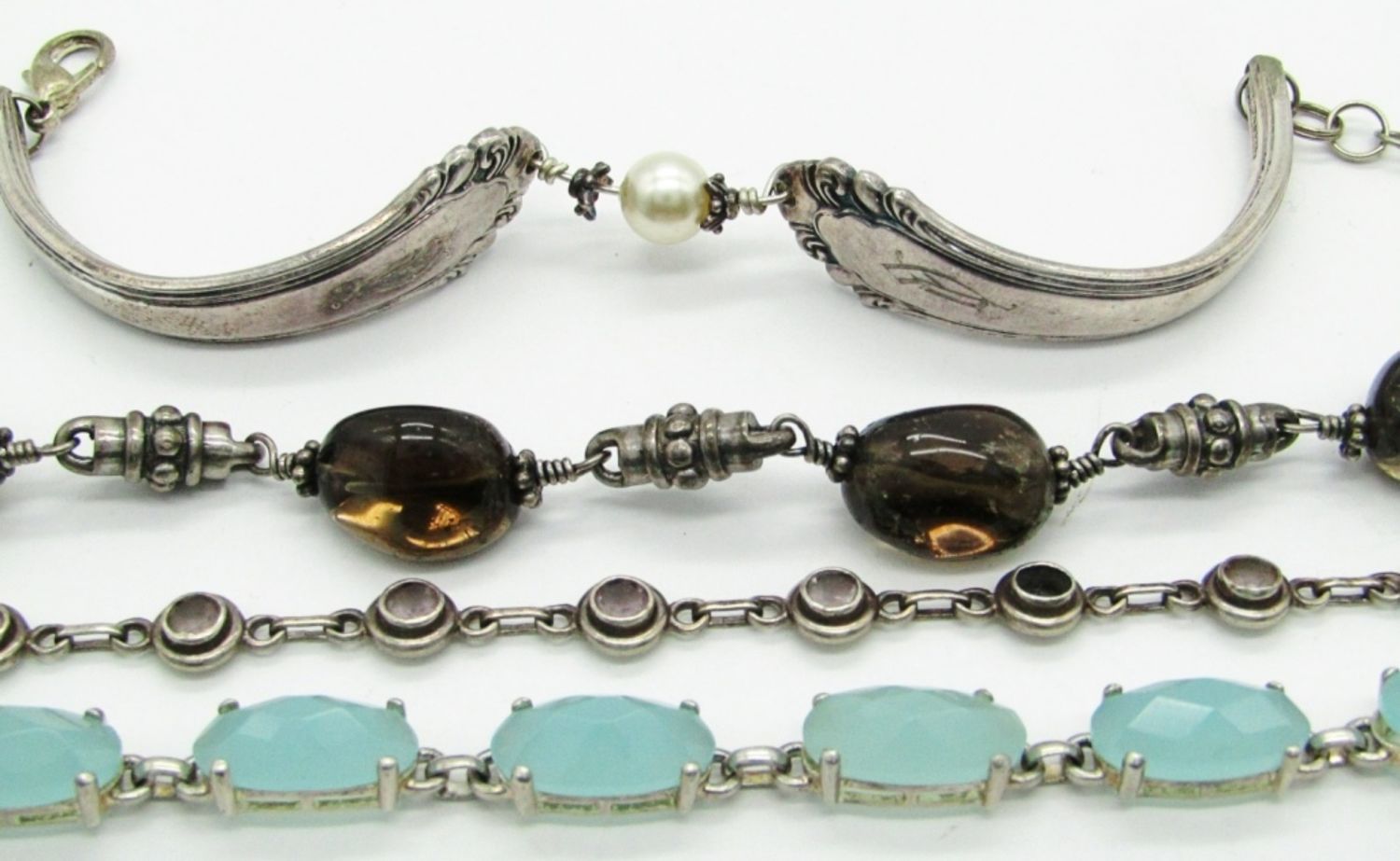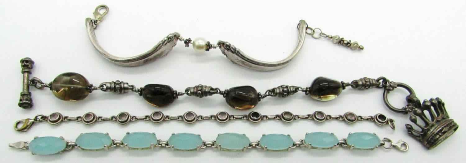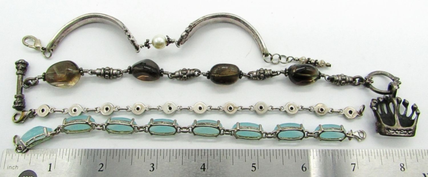 8″ EXEX Claudia Agudelo Sterling Silver & Smokey Quartz With Crown, 7″ NF Thailand 925 Chapel Zenray Sterling Silver Bracelet, 7″ Pat. 1937 Spoon Bracelet, 7.5″ 925 Sterling Silver with Purple/White Rhinestones (Missing 2); 55 dwt.