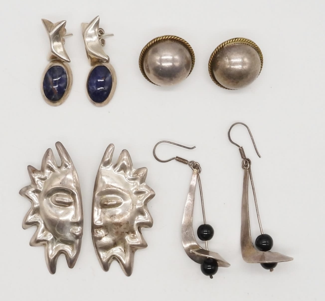 36DWT, PIERCED ONE SET MISSING BACKING, PAIRS ARE- SUN TM-01, CIRCLE TH-15, XO WITH INLAY BLUE STONE TA-18, BLACK ONYX TR-53, ALL STAMPED 925