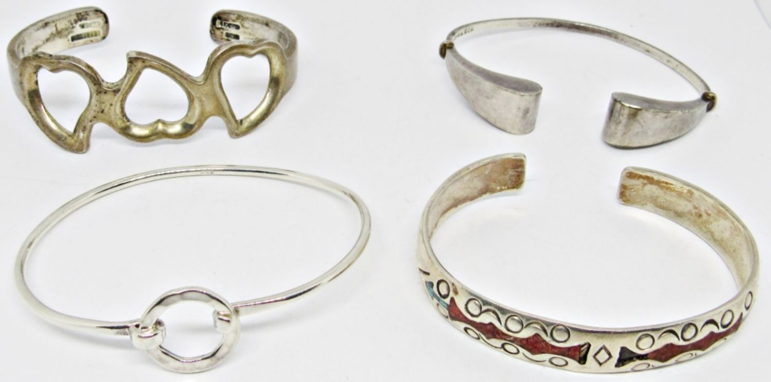 STERLING CUFF STYLE BRACELETS; VARIOUS DESIGNS; MARKED “MEXICO” & 925 – (1) missing few chips in bracelet (43 DWT)