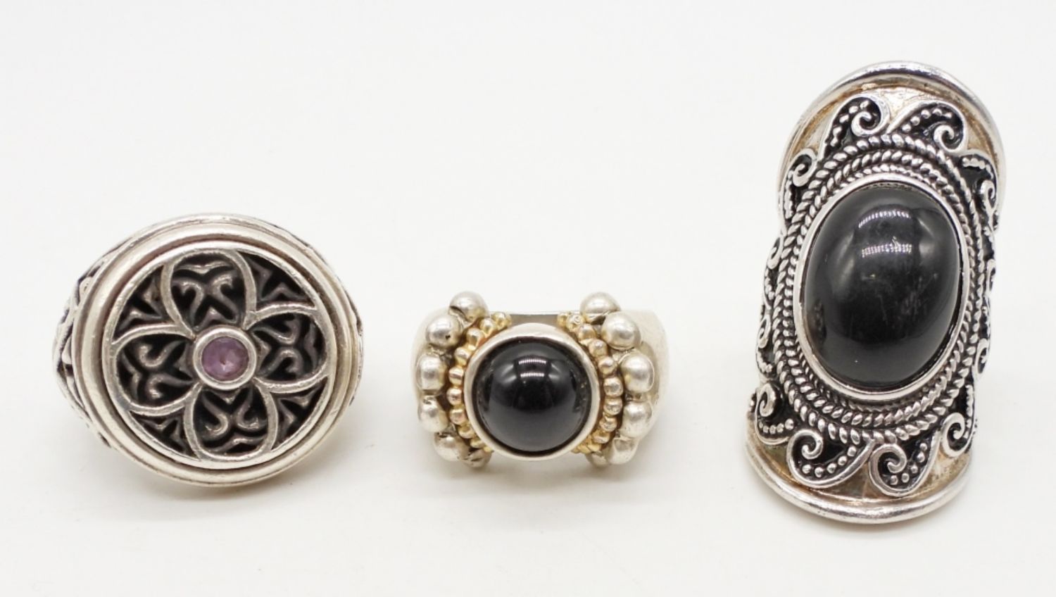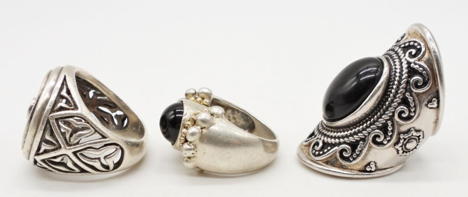 LARGE FASHION STERLING SILVER RINGS WITH BLACK ONYX & ORNATE DESIGNS, STAMPED 925, SIZES 6-8, 35 DWT