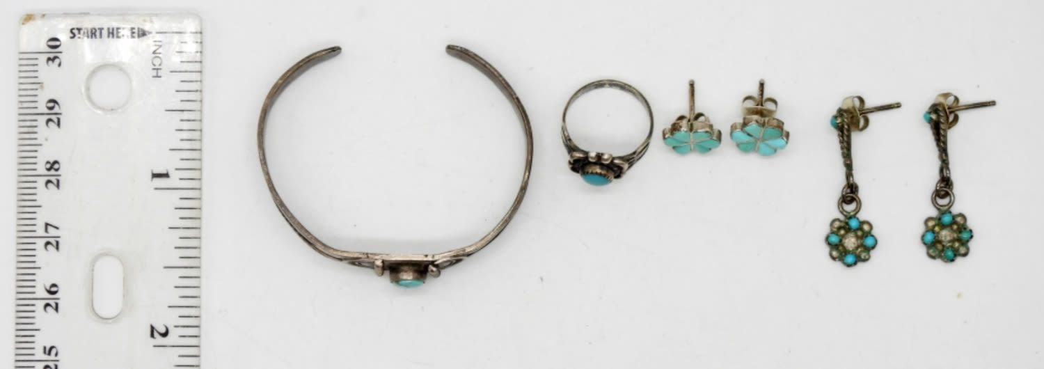 (2) PIERCED EARRINGS (1) RING size 2.5 & CUFF BRACELET 5″ with GAP slightly adjustable – ALL with SLEEPING BEAUTY / TURQUOISE STONES (7 dwt)