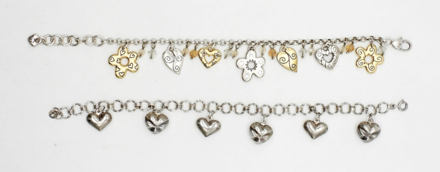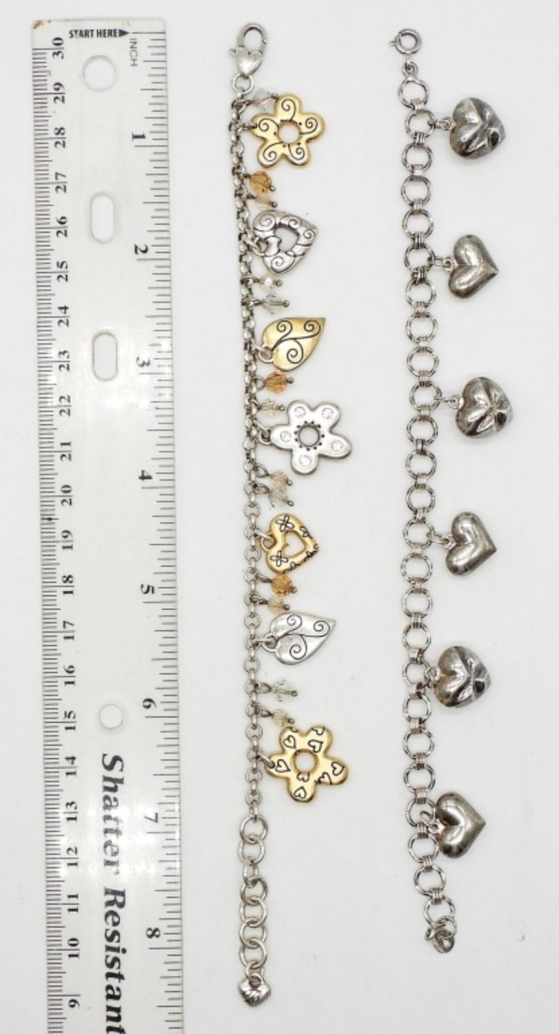 (2) STERLING SILVER CHARM BRACELETS, 7.5″ & 8″ LENGTHS; SILVER & GOLD TONE HEART CHARMS; MARKED 925 STERLING; (26 DWT)