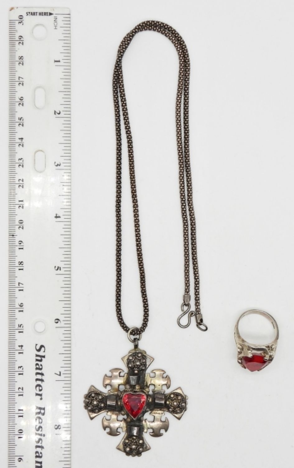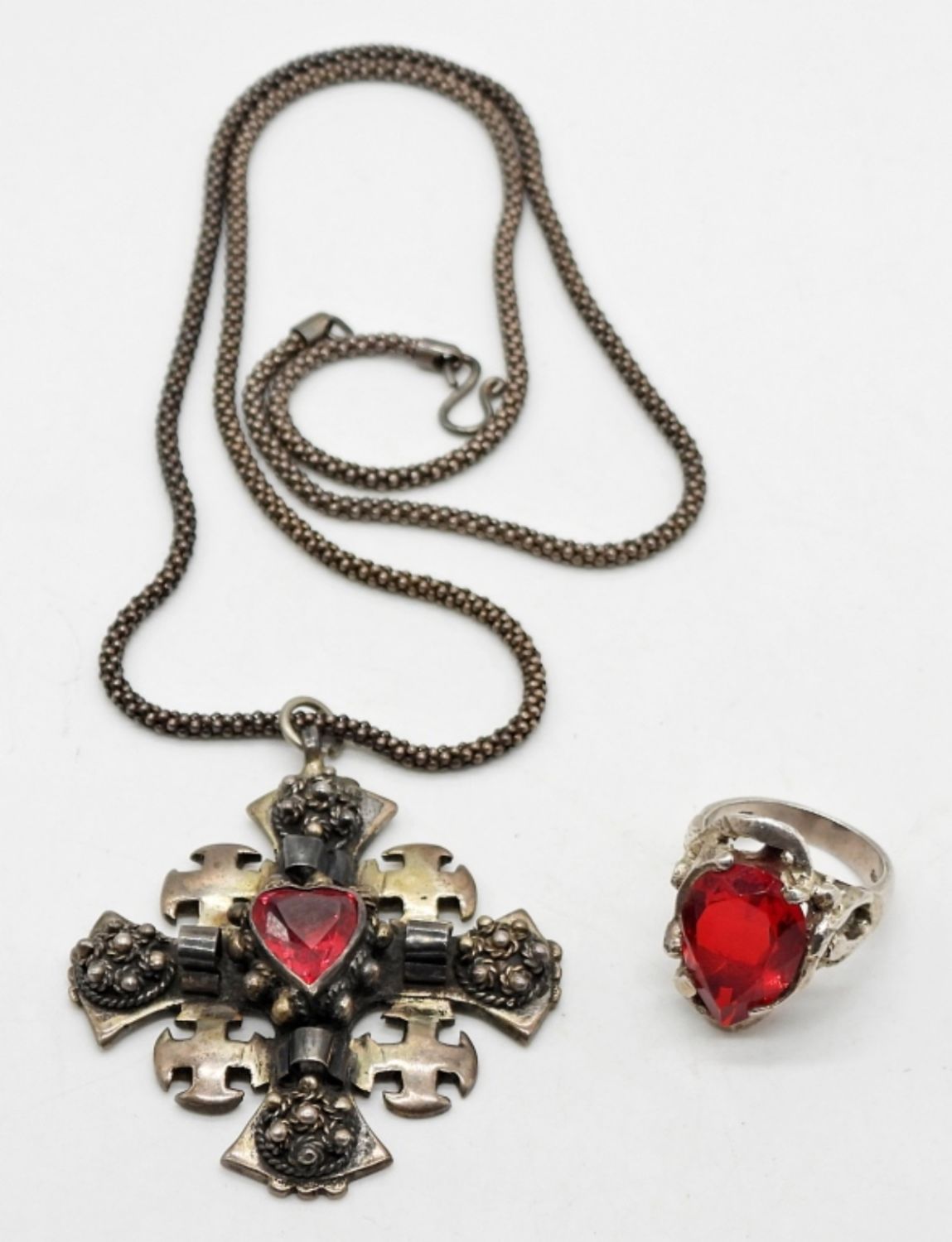 25″ STERLING SILVER CHAIN WITH CROSS PENDANT WITH HEART-SHAPED CENTER RED GEMSTONE, MARKED SILVER JERUSALEM; MATCHING STERLING RING WITH LARGE RED CENTER GEMSTONE – SIZE 8.5 – MARKED 925; (35 DWT)