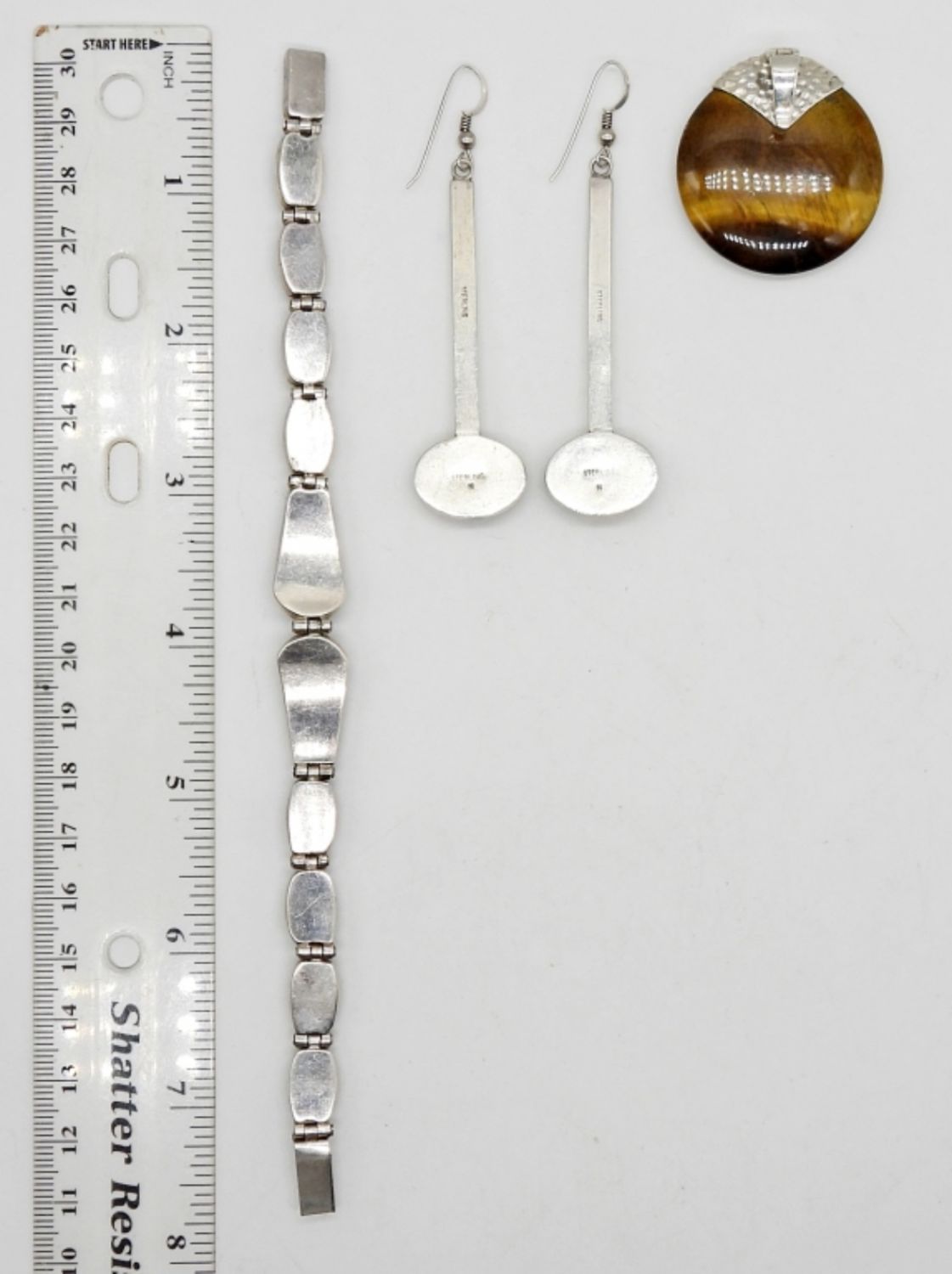 STERLING SILVER & TIGER’S EYE 3-PIECE JEWELRY SET INCLUDING MATCHING EARRINGS, PENDANT & 7.5″ BRACELET – MARKED STERLING – 925 CHINA; (35.5 DWT)