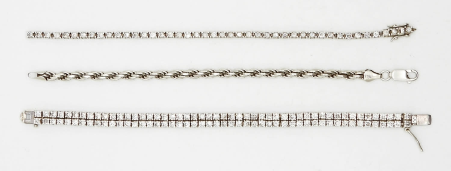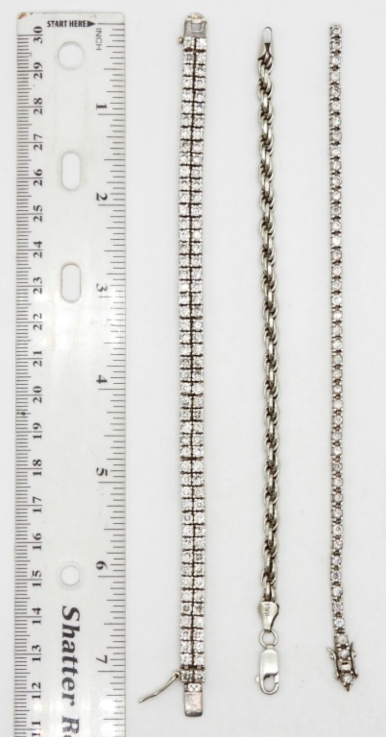 (3) 7″ STERLING SILVER TENNIS BRACELETS – MARKED 925 THAILAND, 925 ITALY; (1) HAS BROKEN CLASP; (28 DWT)
