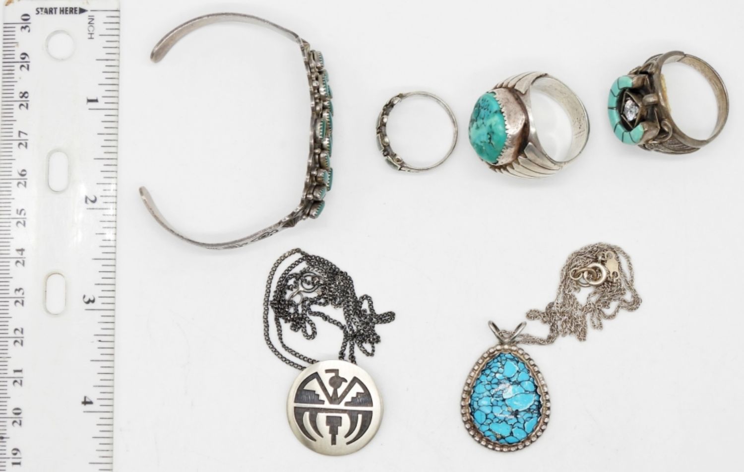 SOUTHWEST TURQUOISE STERLING SILVER JEWELRY LOT INCLUDING: (1) CUFF BRACELET, (2) NECKLACES, (3) RINGS – SIZES 7, 9, & 10.5; STAMPED STERLING; (48.3 DWT)