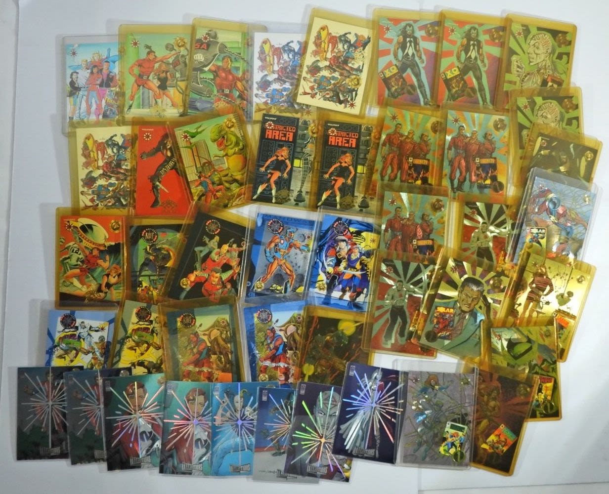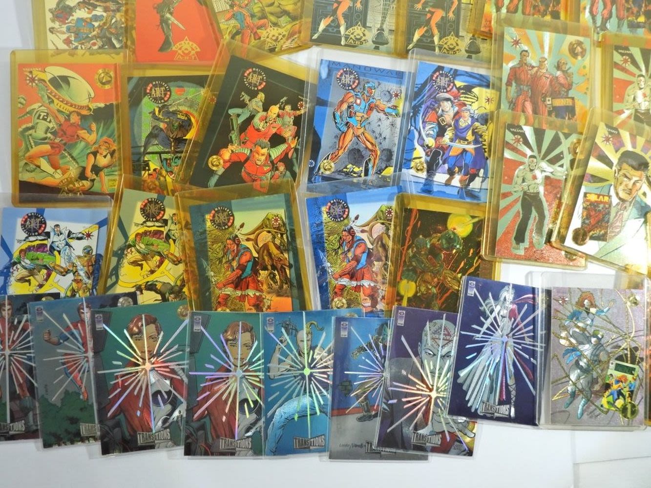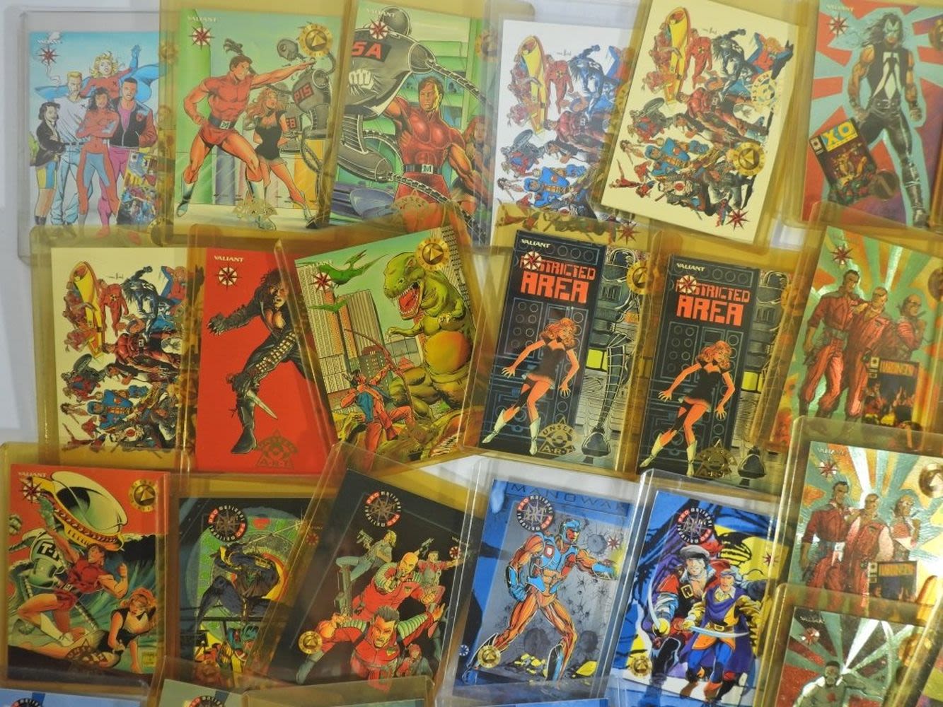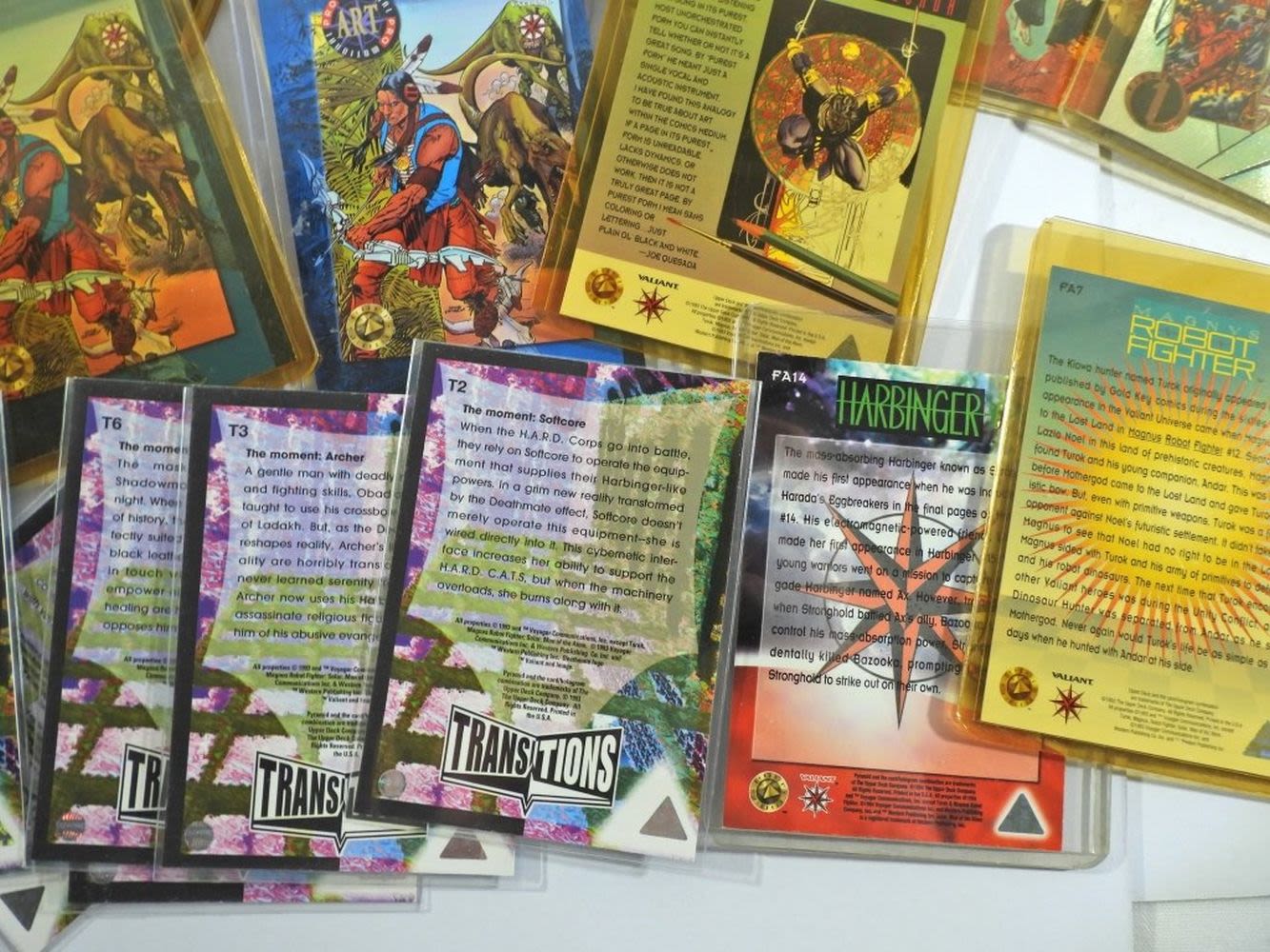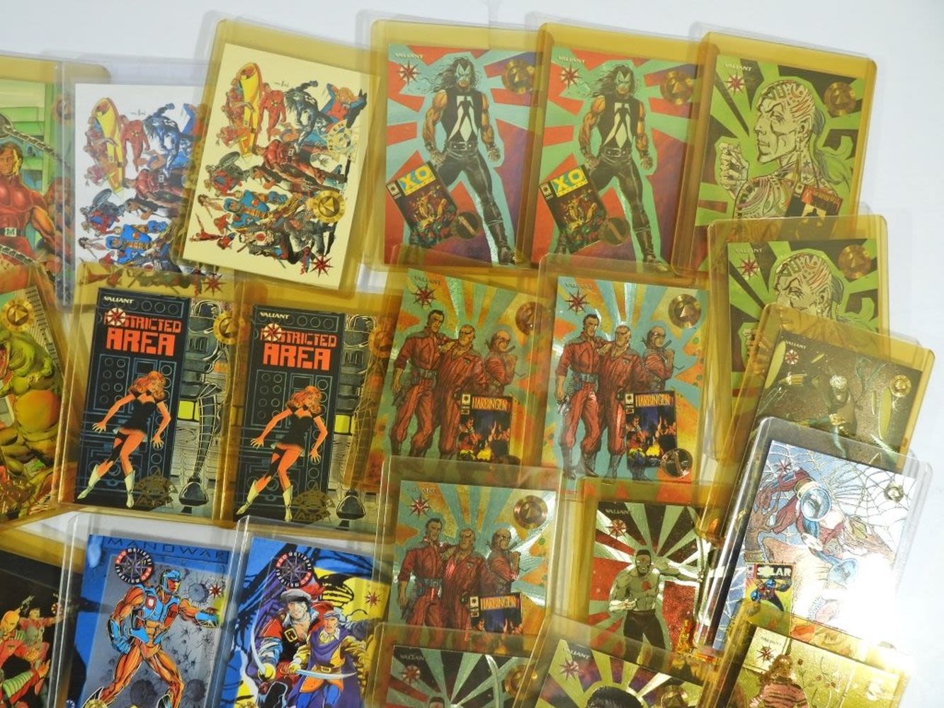 (8) 1993 Transitions Deathmate (T1-3, 6-8), 1993 The Art of Joe Quesada SP1, (8) 1994 Valiant Comics Promotional Art Cards (PA1, 2, 6, 7, 8, 9, Duplicates), (10) 1993 Valiant Unseen Art Cards (U1, 2, 5, 6, 7, 8, 9, Duplicates), (17) 1993 & 1994 Valiant First Appearances Foil Cards (FA1, 2, 3, 5, 7, 8, 10, 11, 12, 13, 14, 15, Duplicates); Good Conditions.