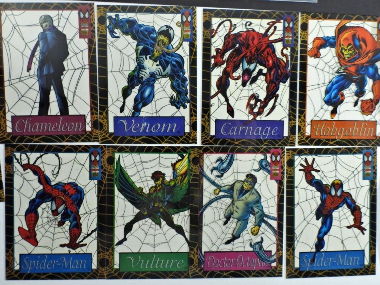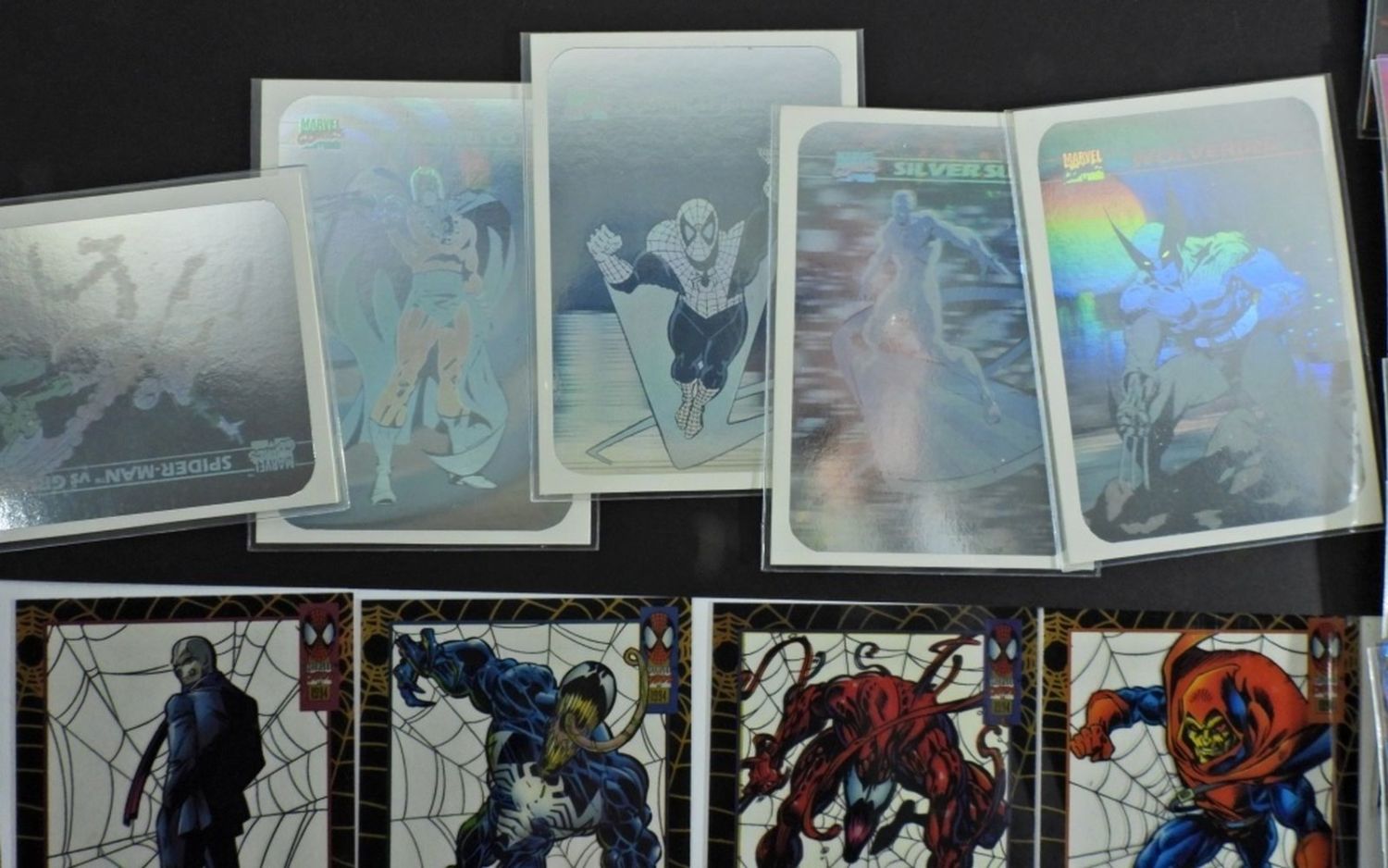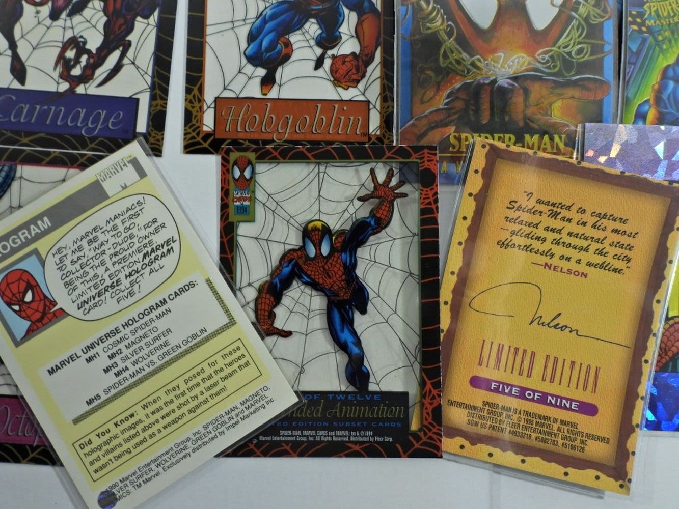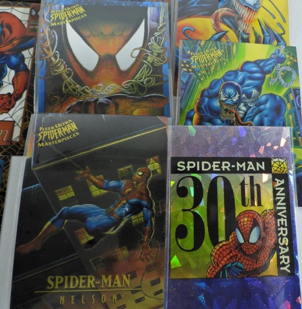 (9) 1995 Marvel Fleer Ultra Spider-Man Masterpieces Complete Set #1-9; (9) 1994 Marvel Fleer Amazing Spiderman Suspended Animation Cards; (5) 1990 Marvel Universe Series 1 Complete Hologram Card Set Spider-Man, Magneto, Silver Surfer, Wolverine, Green Goblin; 1992 Marvel 30th Anniversary Spider-Man Holo Prism Card; All Like New/Good Conditions.