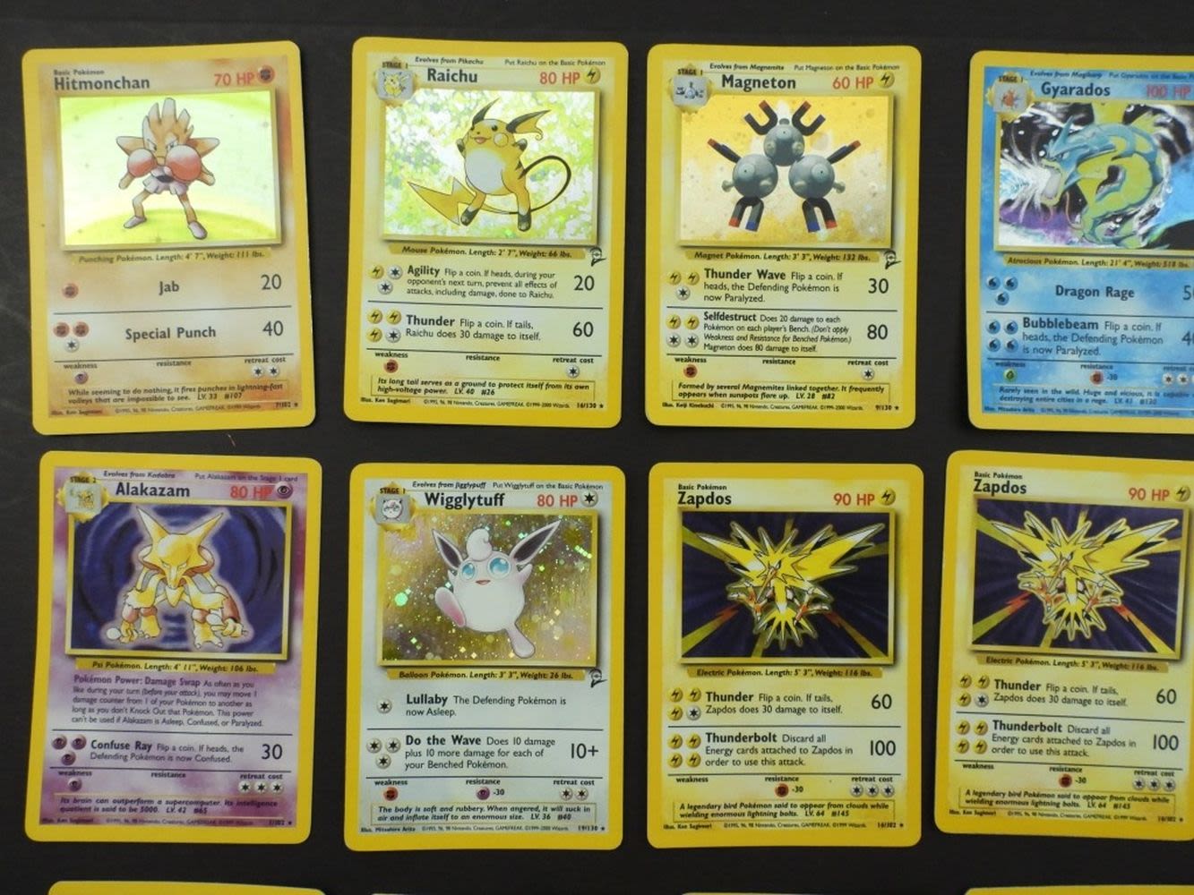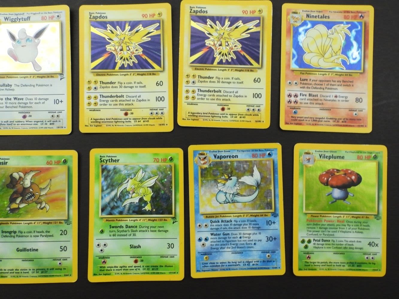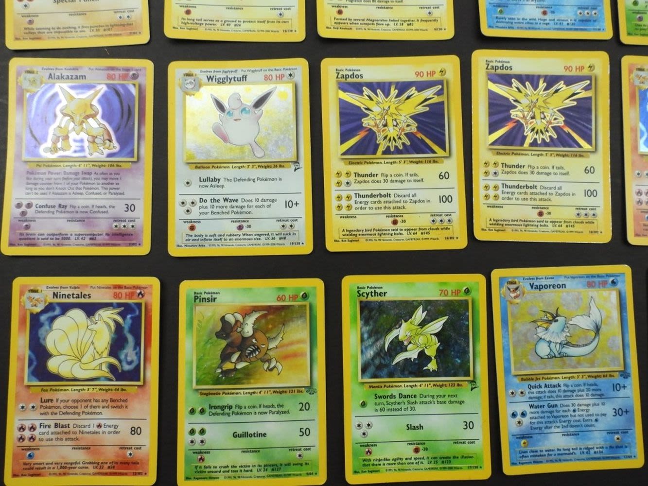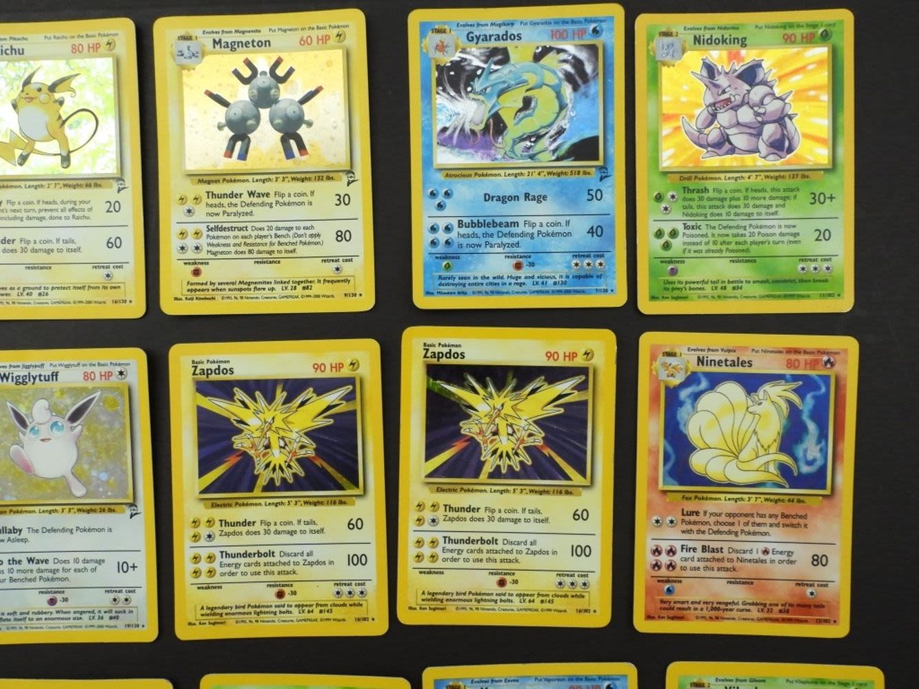 VILEPLUME 15/64, VAPOREON 12/64, SCYTHER 17/130, PINSIR 9/64, (2) NINETALES 12/102, (2) ZAPDOS 16/102, WIGGLYTUFF 19/130, ALAKAZAM 1/102, NIDOKING 11/102, GYARADOS 7/130, MAGNETON 9/130, RAICHU 16/130, HITMONCHAN 7/102 – EX/VGEX or BETTER