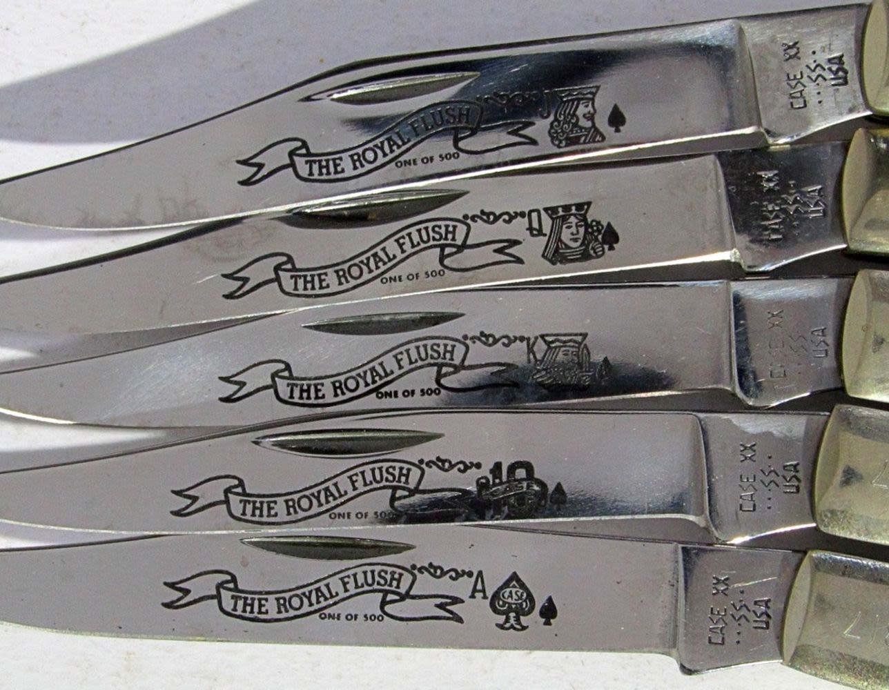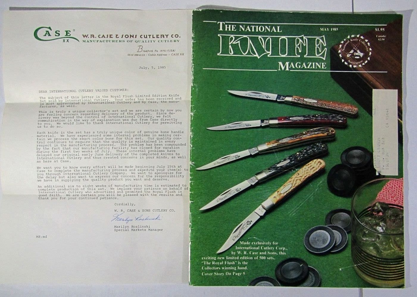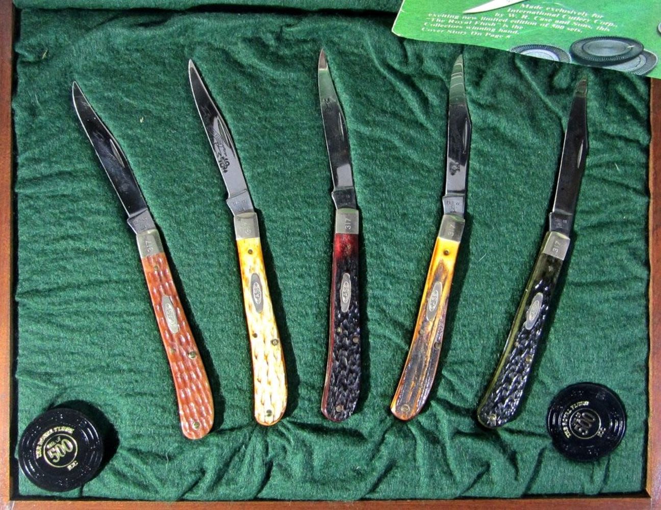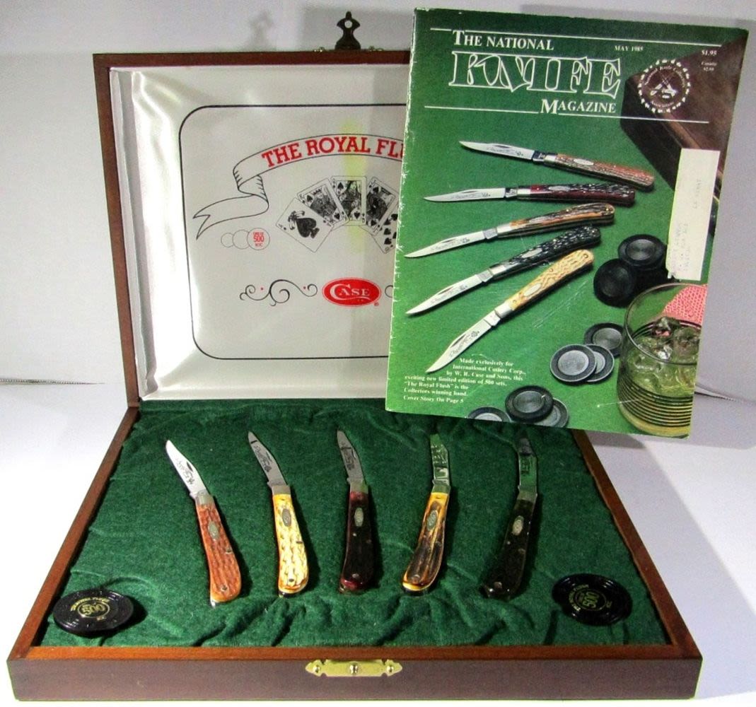 #317 of 500 Made; Bone & Stag Handles; Wooden Display Box, Includes National Knife Magazine May 1985 (Cover is This CaseXX Knife Set!); Good Condition.