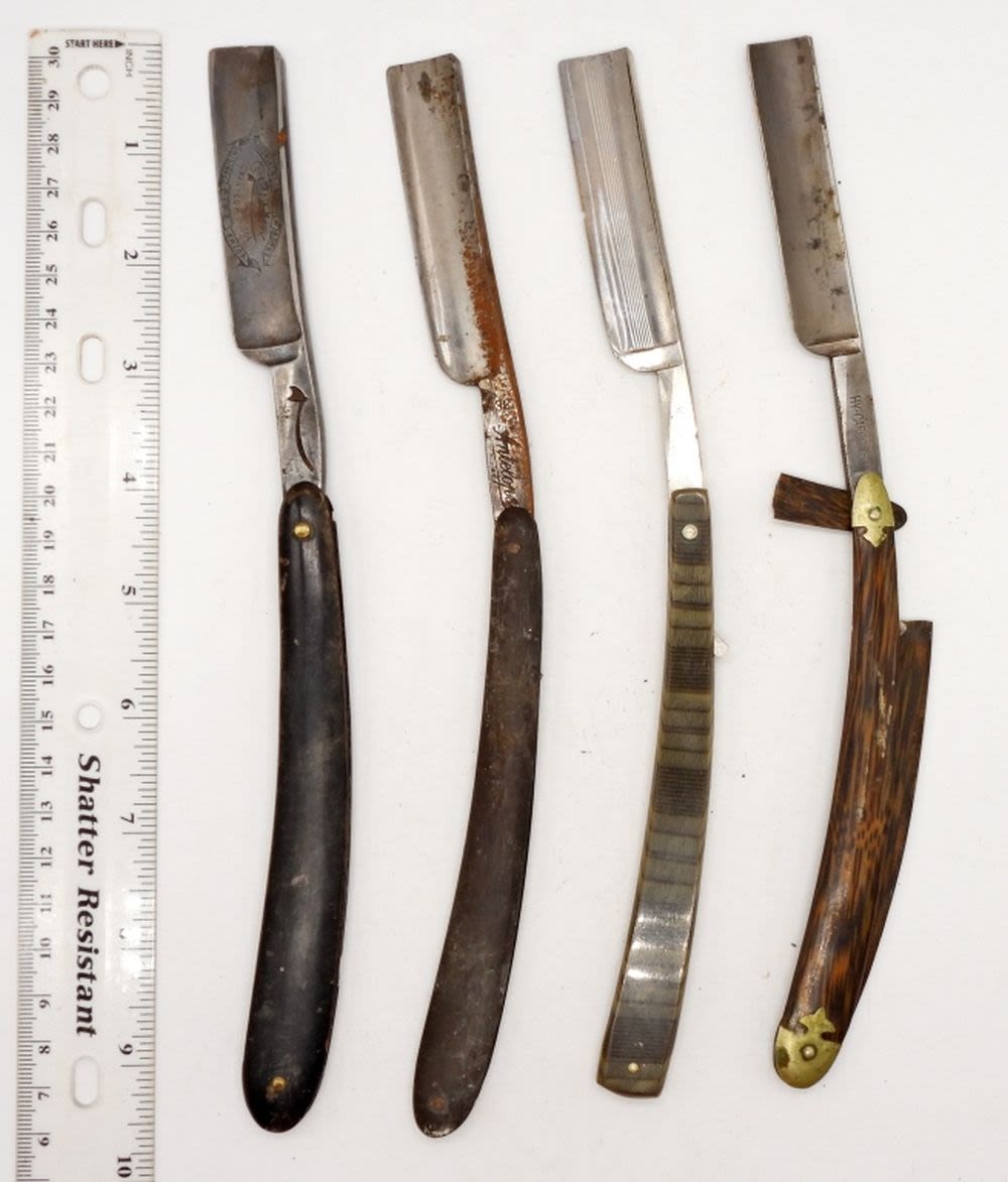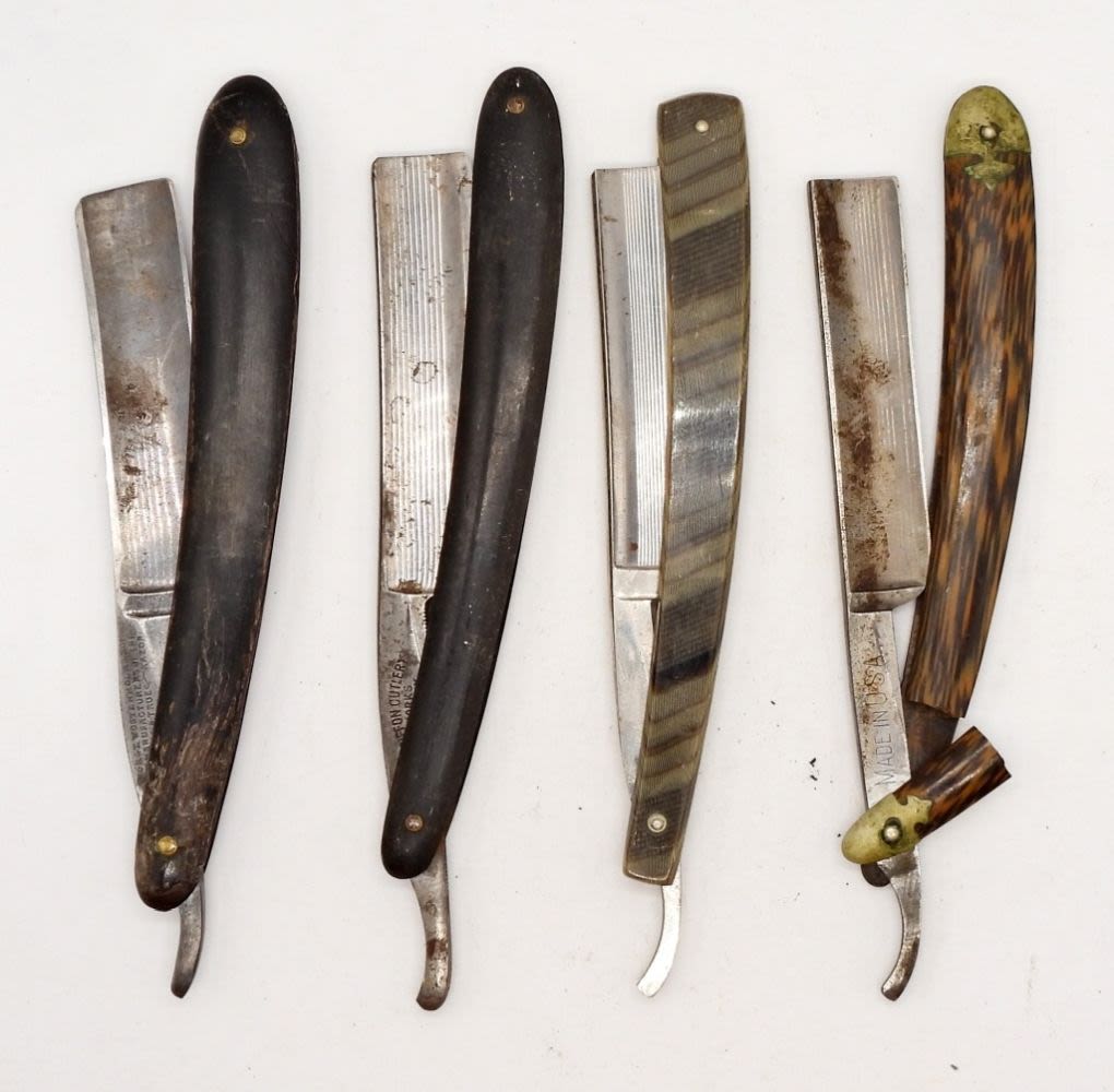 INCLUDING GRIFFON CUTLERY WORKS GERMANY, CLAUSS FREMONT OHIO, GEORGE WOSTENHOLM & SONS ORIGINAL PIPE RAZOR, & MADE IN USA HY-CARBON STEEL (HANDLE DAMAGED)