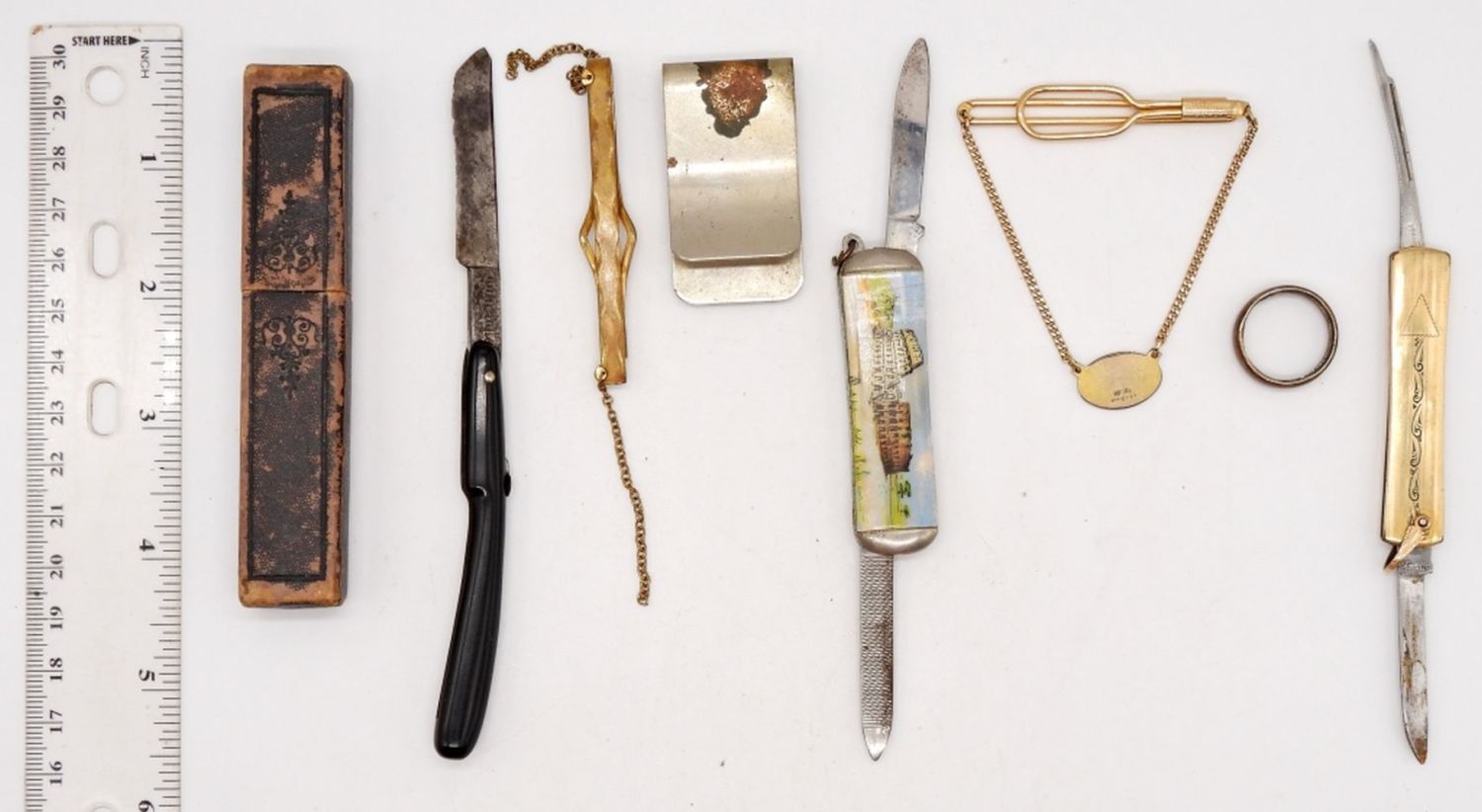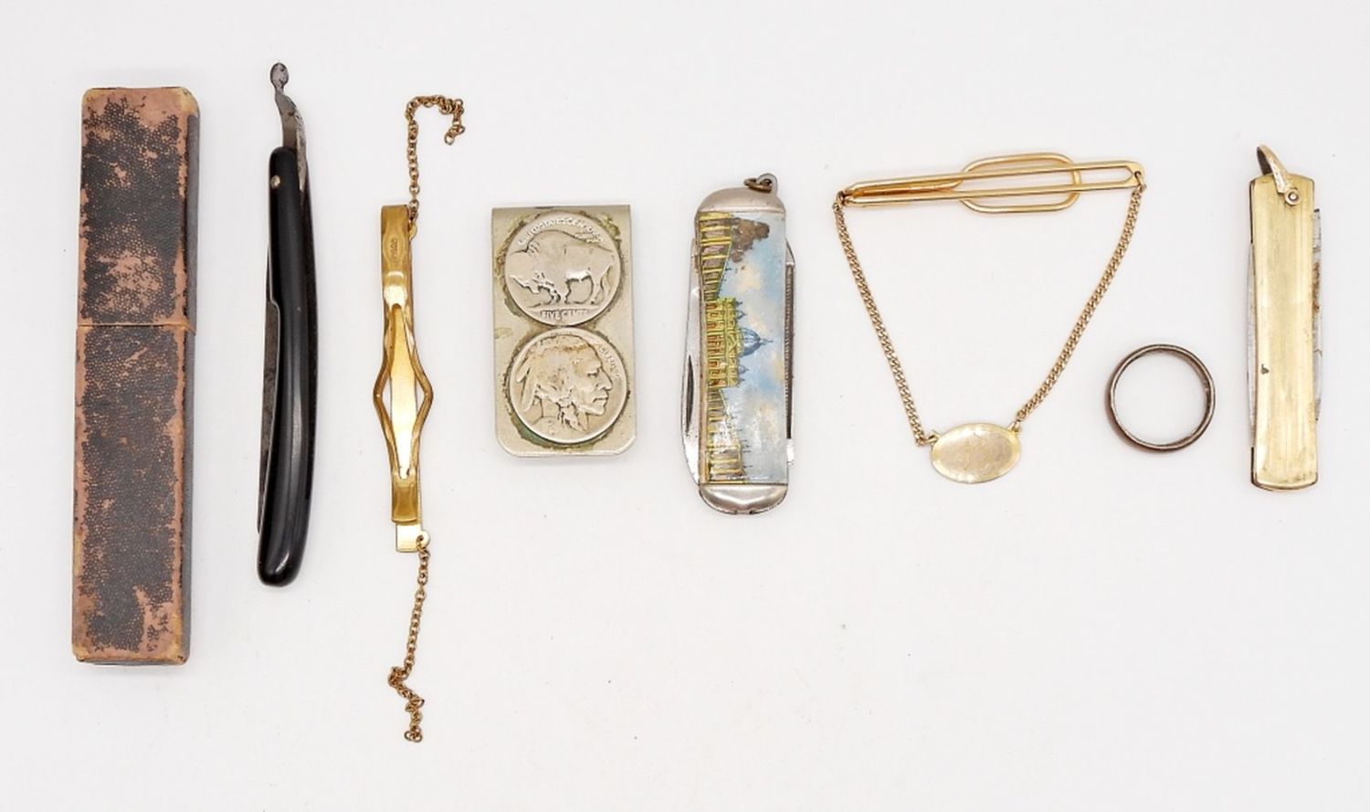 CLIP with BUFFALO NICKELS, TIE CLASP, RING MADE FROM 1907 COIN, SMALL ANTIQUE RAZOR