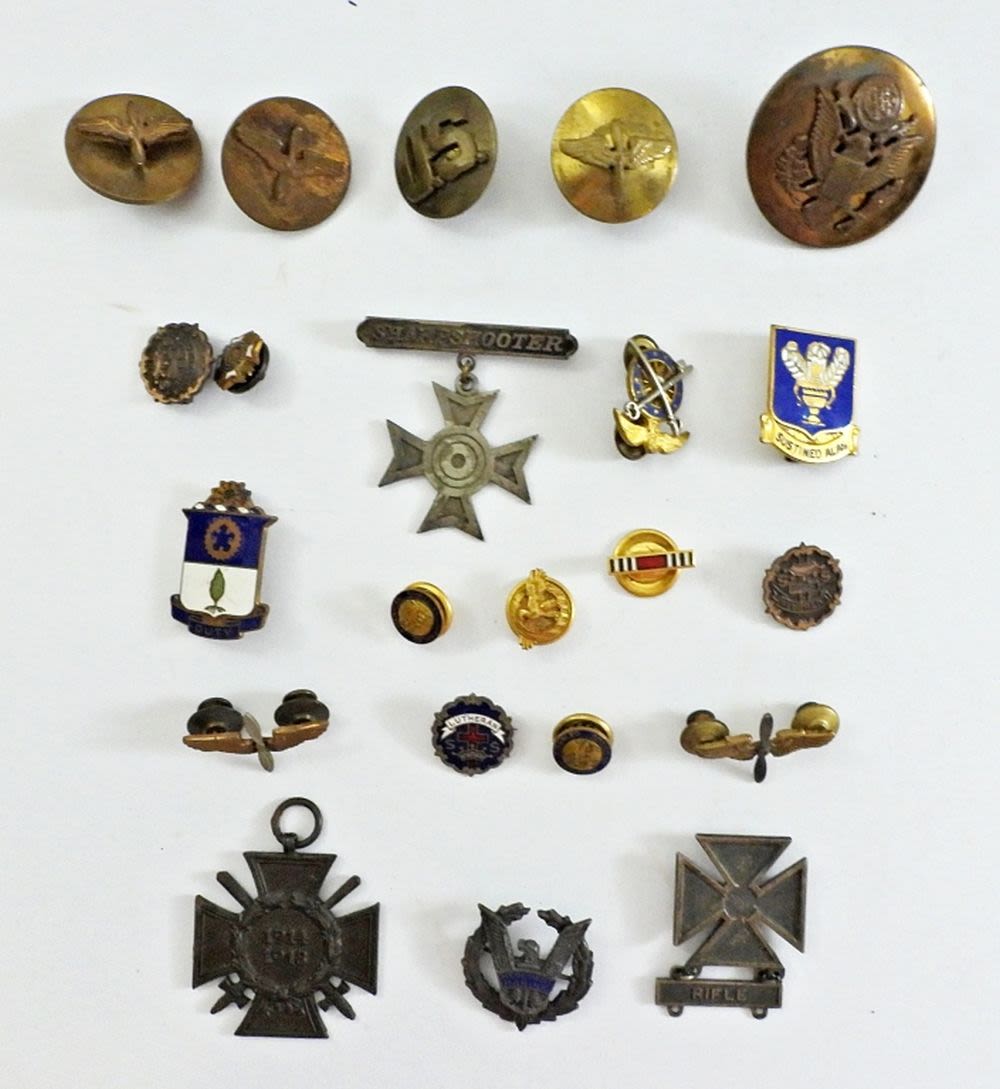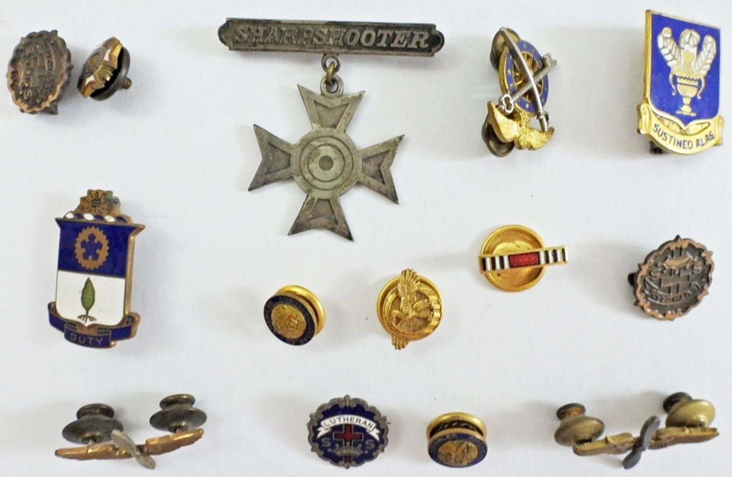 (2) PILOT PINS, SHARPSHOOTER PINS, (2) PILOT SCREW BACK PINS, MERCHANT MARINE PIN, VETERANS PINS & MORE
