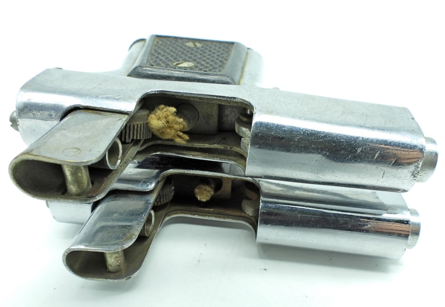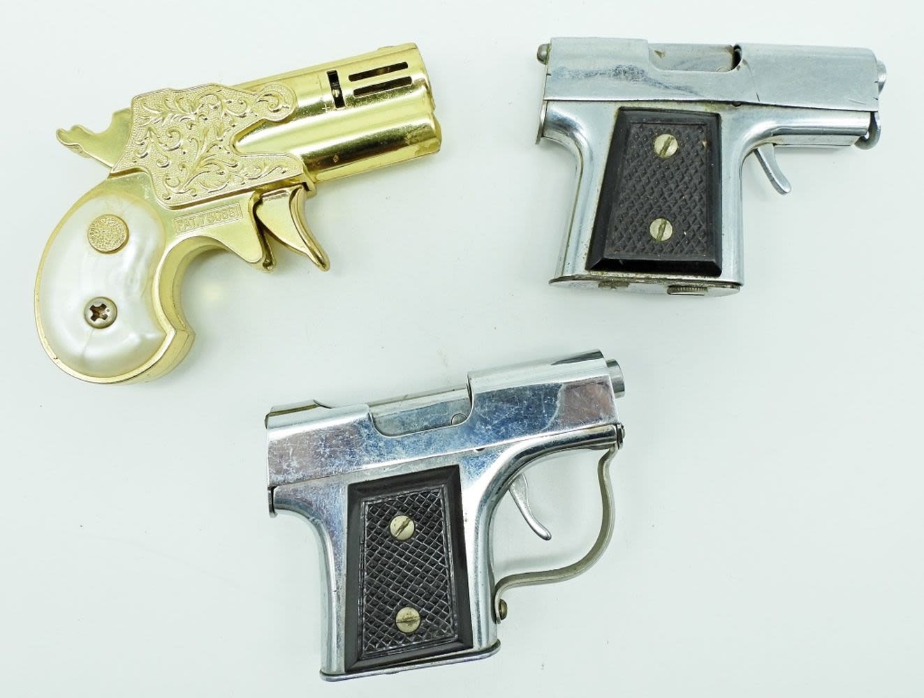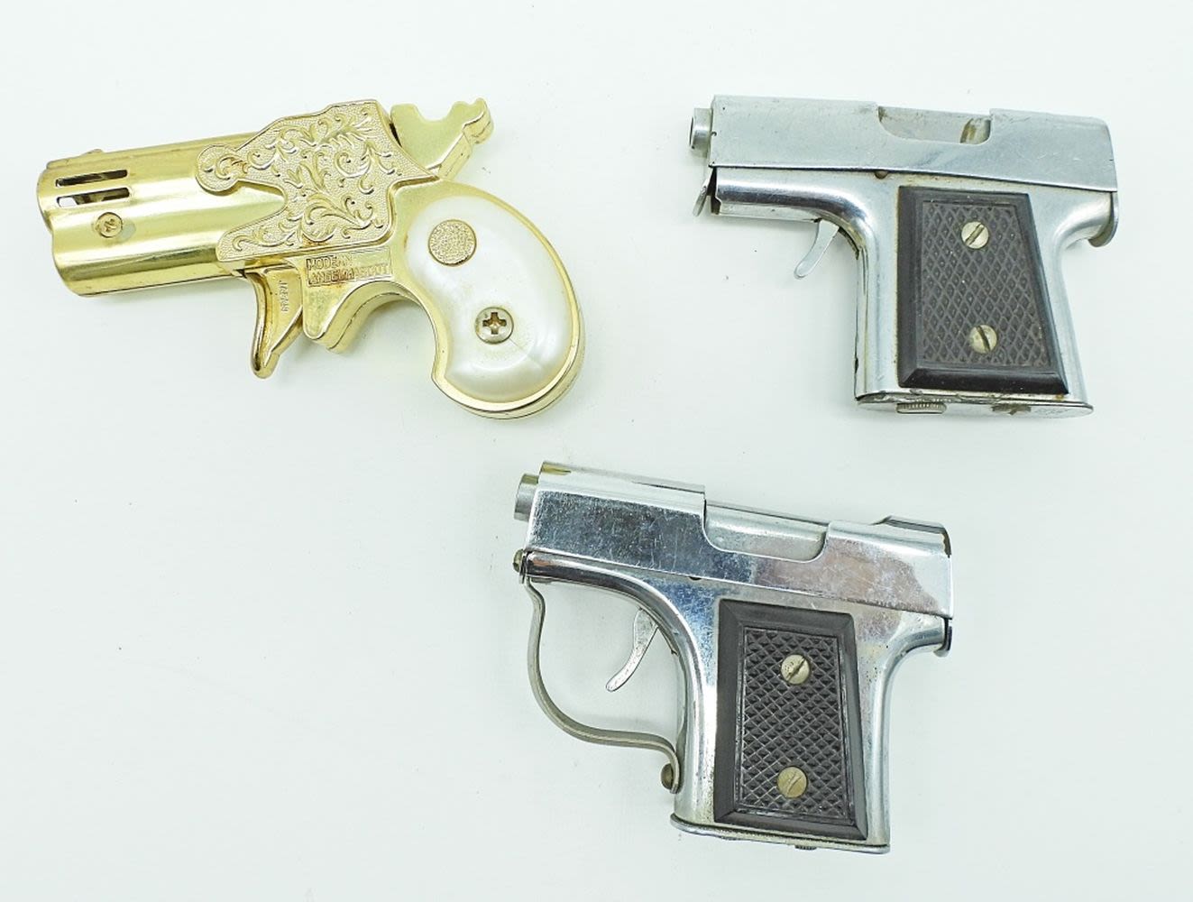 1- GOLD TONE WITH WHITE MOTHER-OF-PEARL STYLE ON HANDLE , MARKED MODERN ANGELMASCOT PAT.730891,2- UNFIRED 1 TRIGGER GETS STUCK BUT DOES CLOSE IF YOU PUSH TIGGER UP NO MARKING