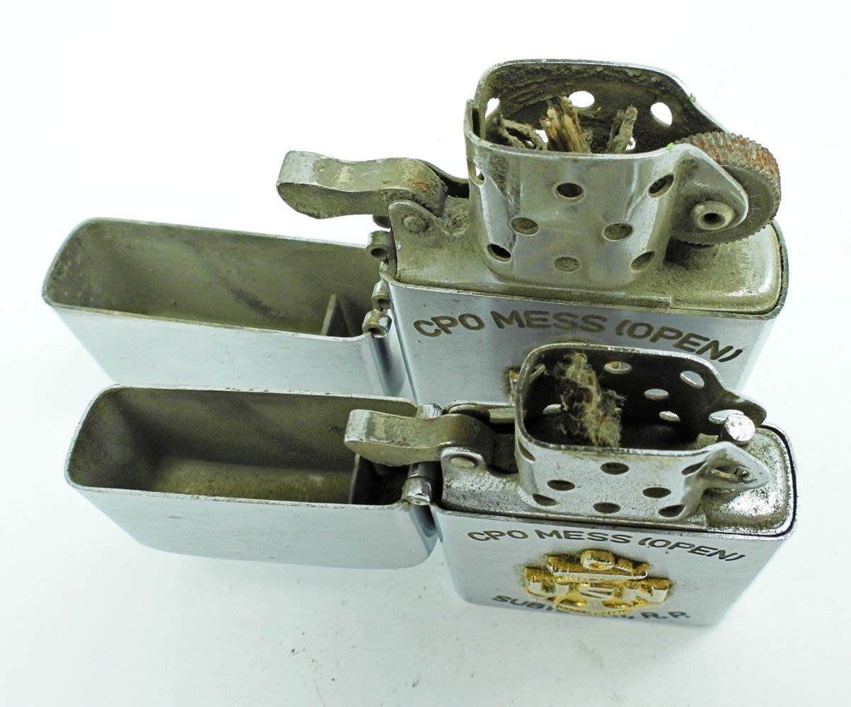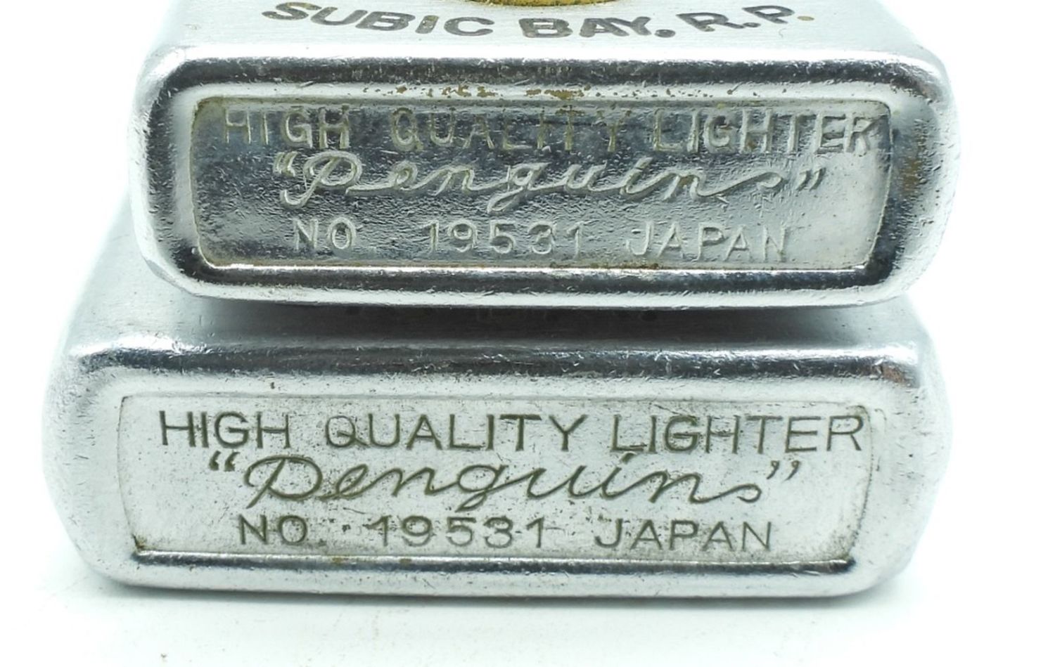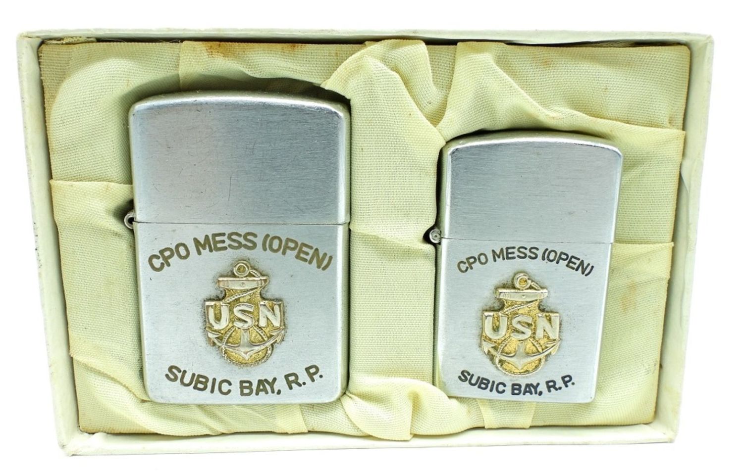 FIRED USED CONDITION, COMES IN A BOX, 1 REG SIZE ONE MINI LIGHTER, HAS THE USN LOGO AND ETCHED “CPO MESS(OPEN) SUBIC BAY, R.P., MADE BY PENGUINS (CAP OFF THE LARGER LIGHTER BAR TO HOLD TOGETHER IS MISSING FOR REPAIR)