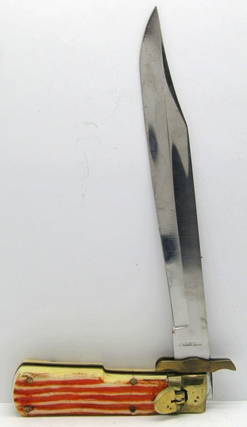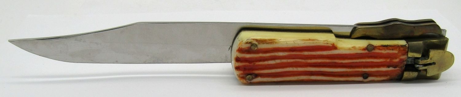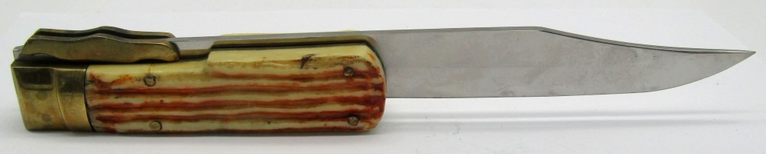 Button is a Locking Mechanism (Works); 7″ Blade, 12 1/4″ Overall Length; Used Condition.
