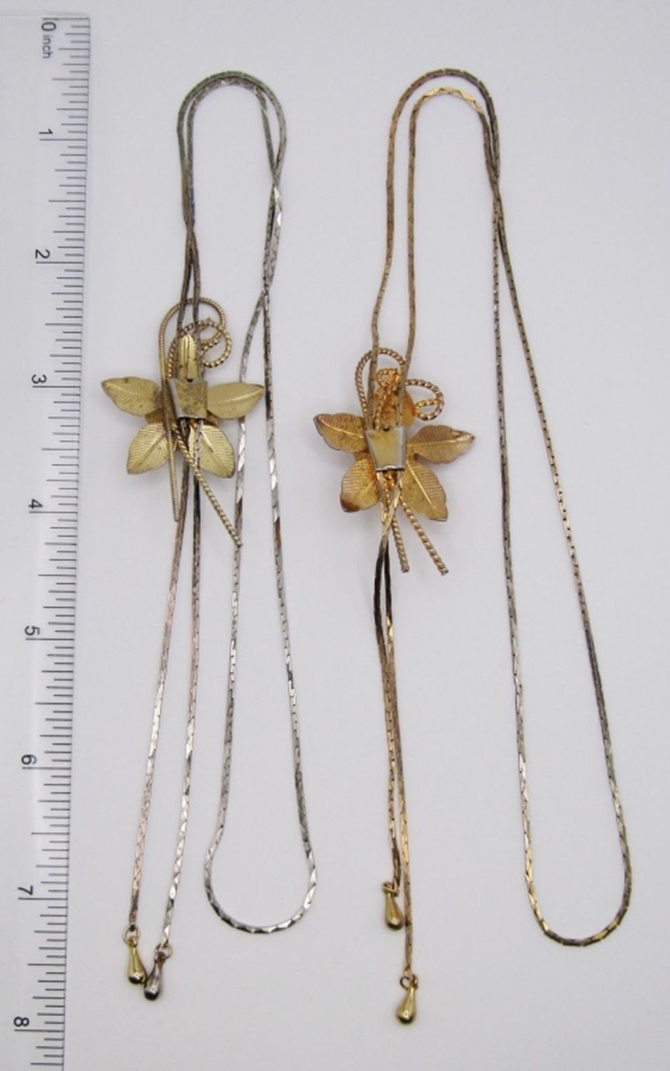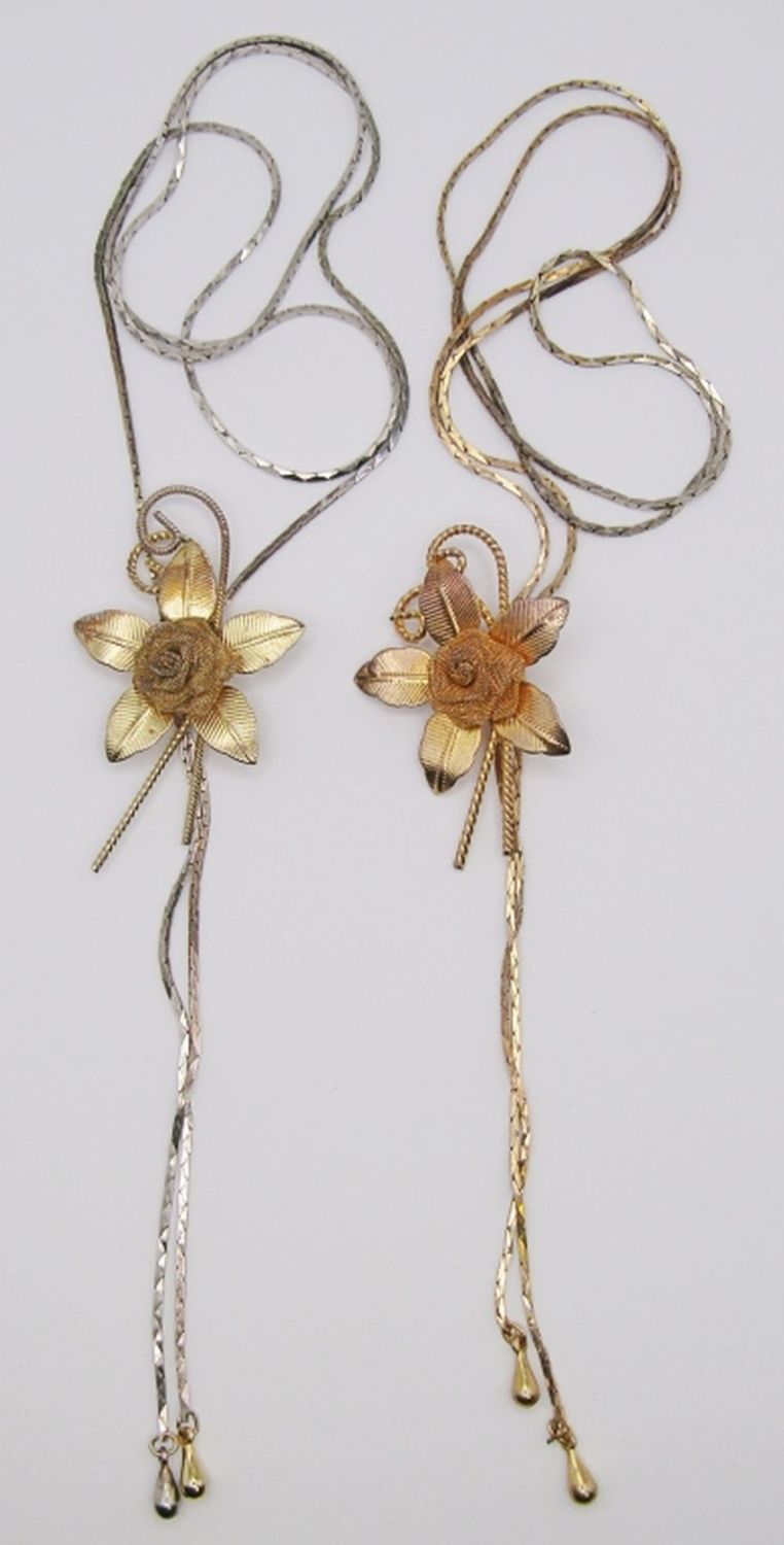 GOLD TONE LARIAT BOLO STYLE SLIDER NECKLACE WITH MESH ROSE & LEAF PENDANT. 28″ CHAIN LENGTH.