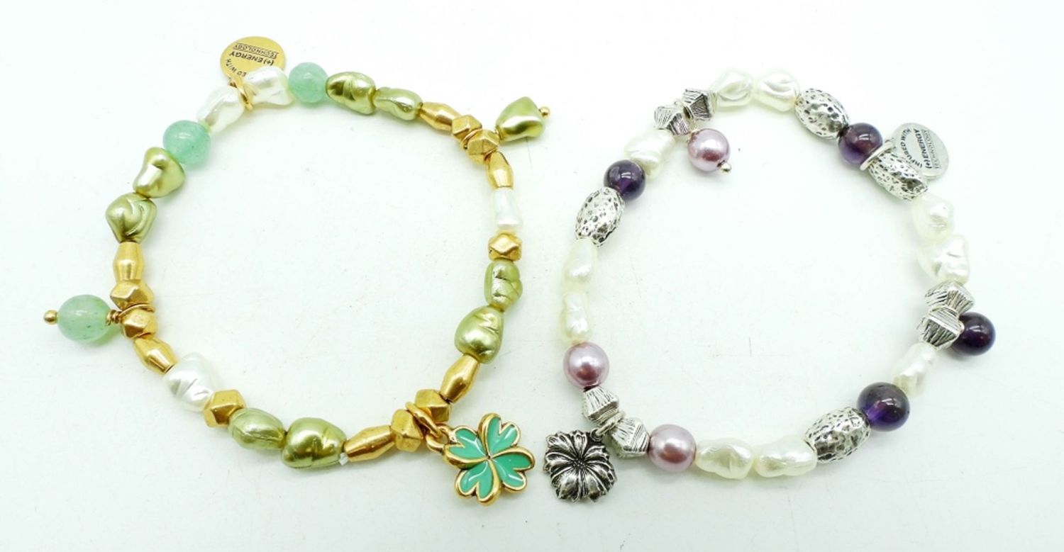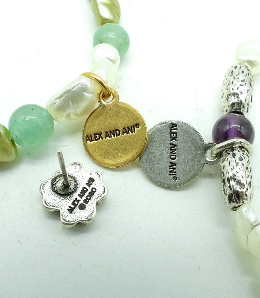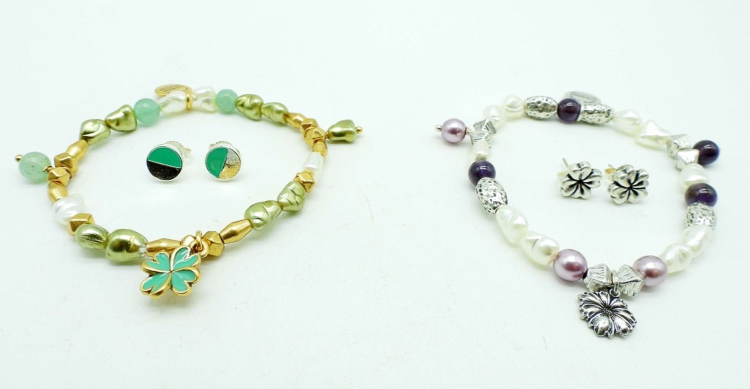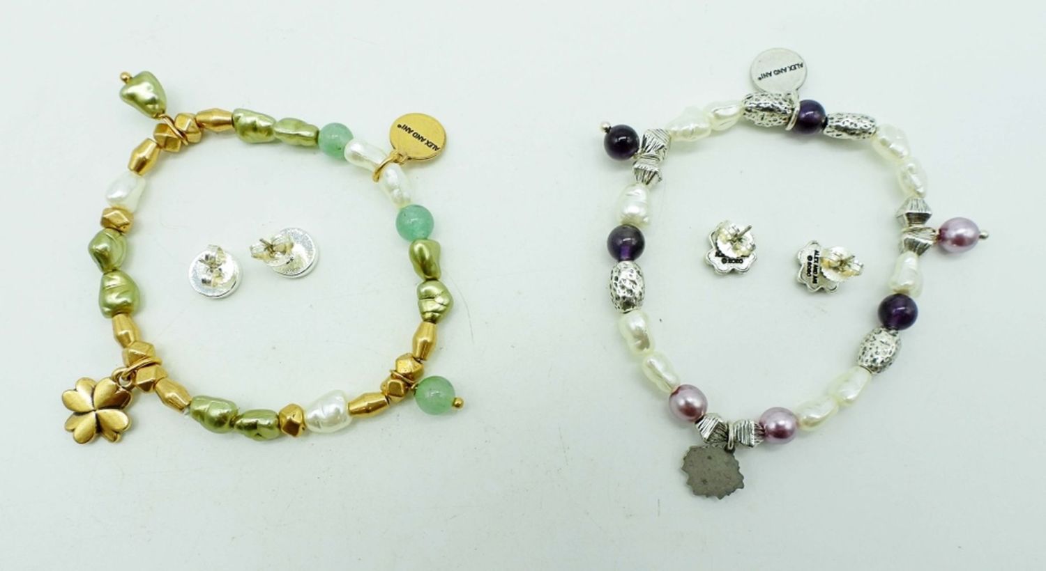 1 FLOWER WITH PURPLE AND SILVER BEADING, FLOWER STUDS, FOUR LEAF CLOVER GOLD TONE AND GREEN BEADING AND CIRCLE GREEN INLAY STUDS