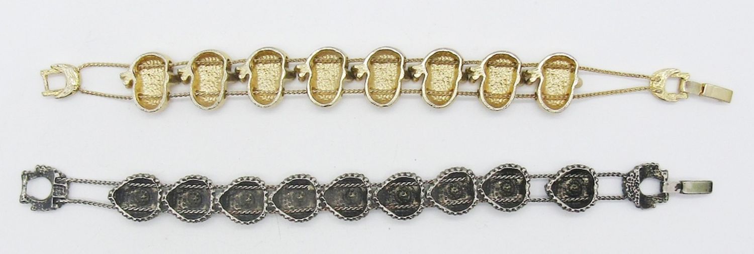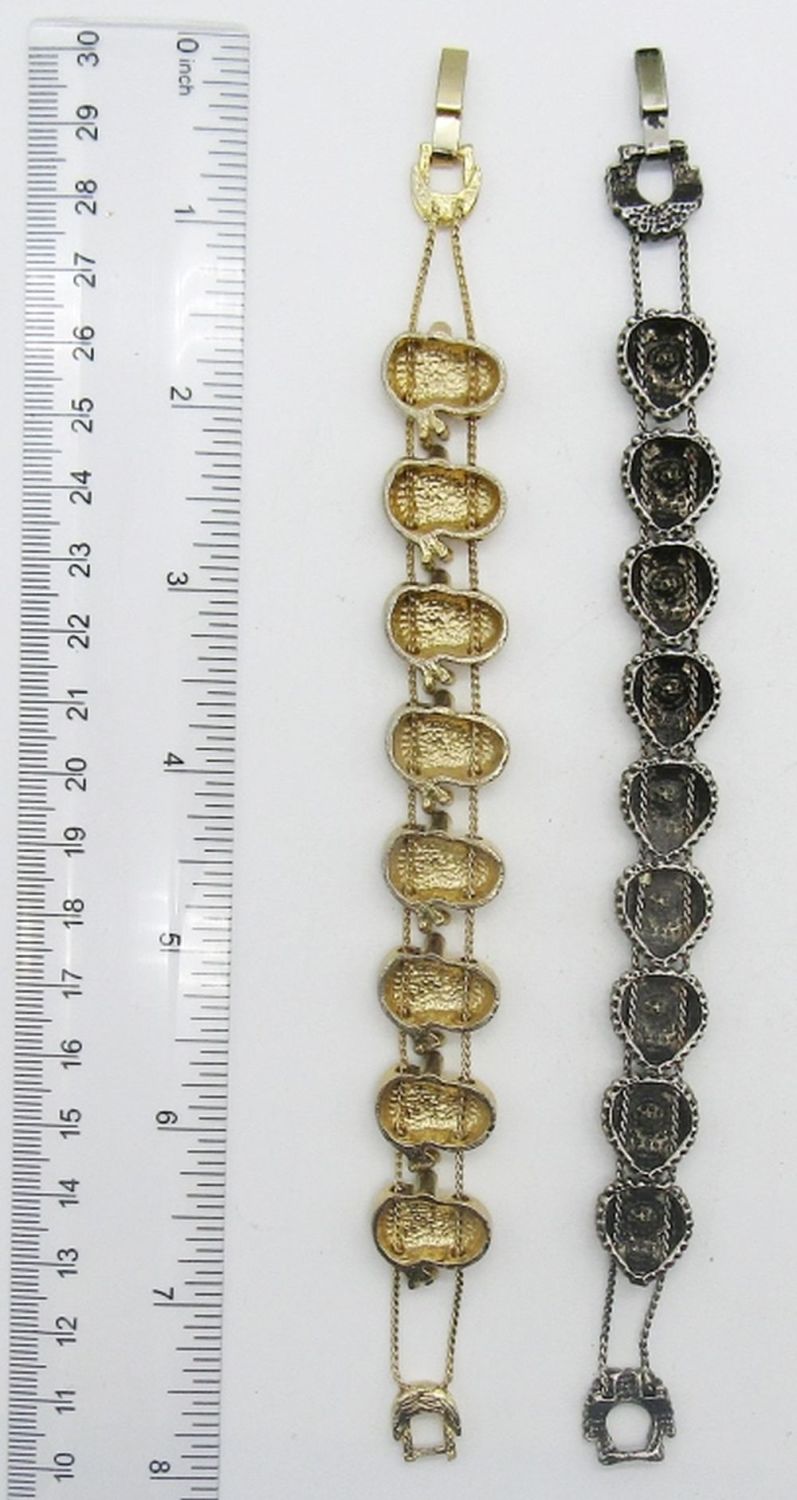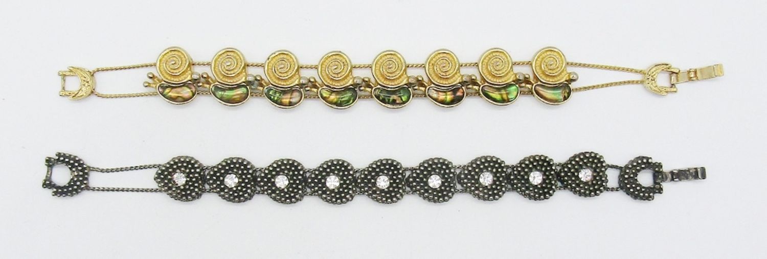 7 1/2IN LONG FOR BOTH, 1 GOLD TONE SNAIL WITH ABALONE INLAY, 1 SILVER TON HEART WITH CLEAR STONES IN THE MIDDLE OF EACH, OPEN BOX CLASP FOR BOTH,