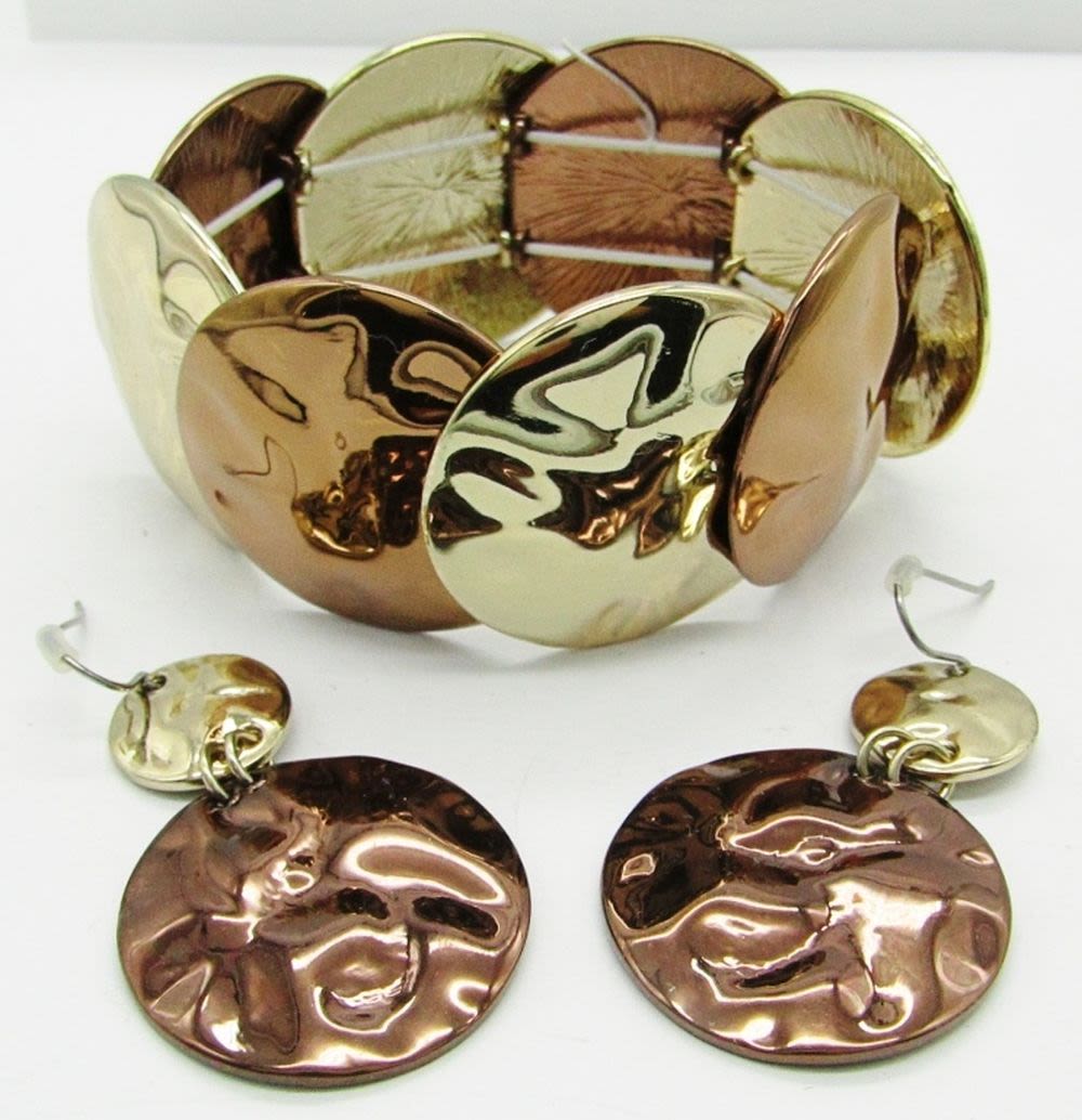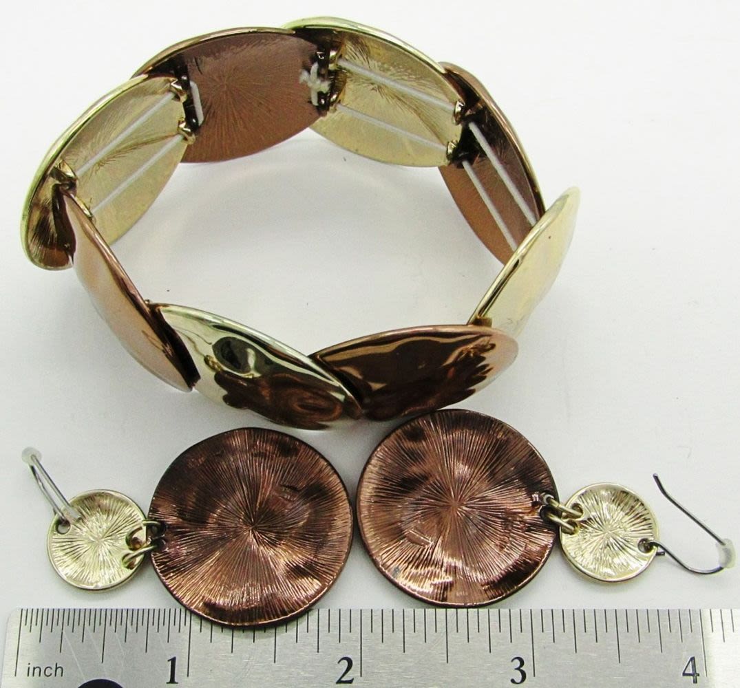 COPPER TONE & GOLD TONE TEXTURED CIRCLE 2.25″ DIAMETER STRETCH PANEL BRACELET & PIERCED DANGLE EARRINGS.