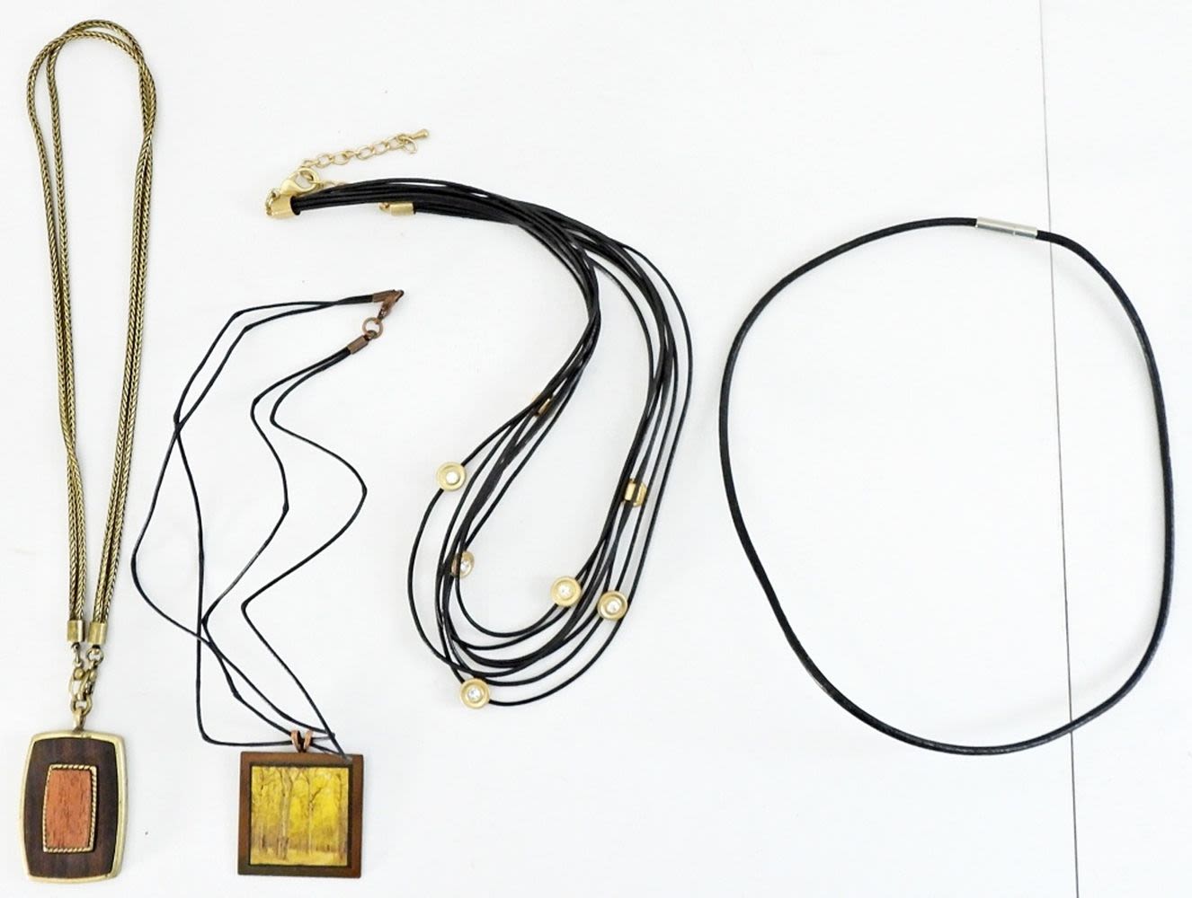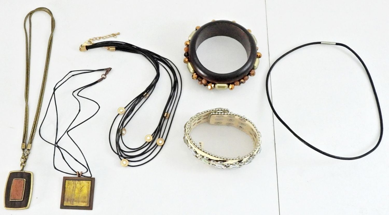 (4) NECKLACE 16″ – 18″ (2) BRACELETS with WOOD BANGLE & LEATHER SNAP 8″