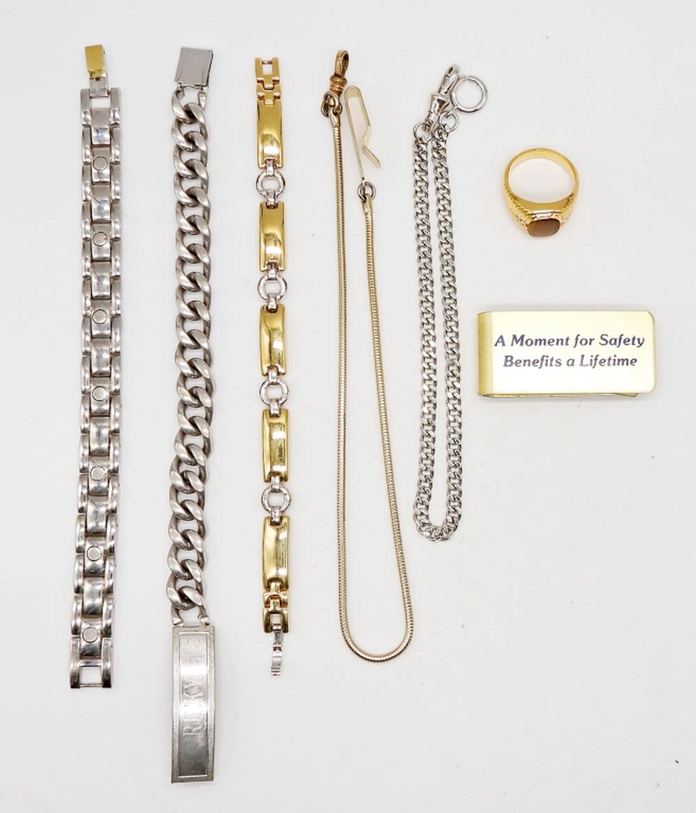 (2) BRACELETS GOLD & SILVER TONE 8″, (1) I D BRACELET “RICKY” 8 1/2″, (2) WATCH CHAINS & MONEY CLIP