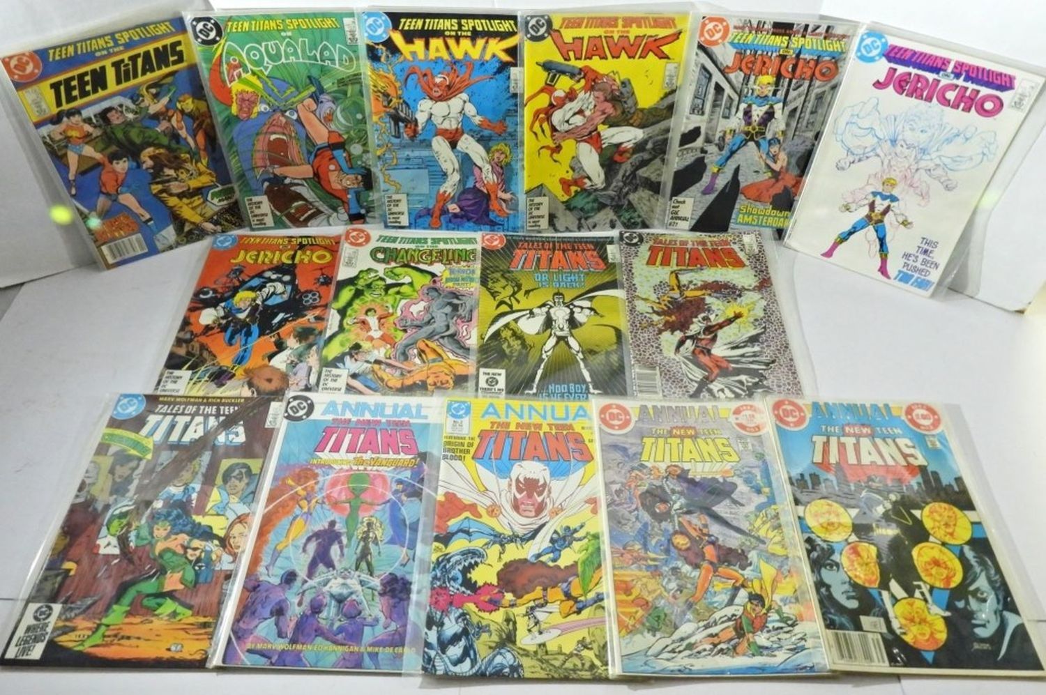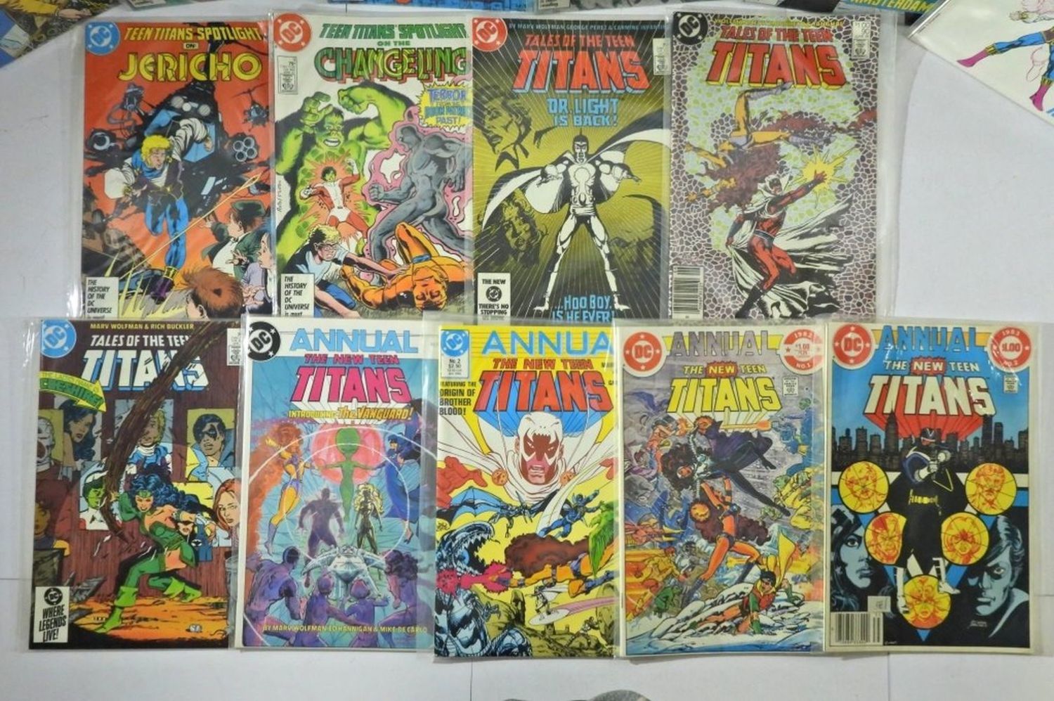 8- TEEN TITANS SPOTLIGHT( TEEN TITANS,AQUALAD ,HAWK, JERICHO, CHANGELING) 3- TALES OF THE TEEN TITANS, 4- ANNUAL THE NEW TEEN TITANS. 9- 75-CENT,4- 1 DOLLAR, 2- 2 DOLLAR ISSUES, ALL GOOD CONDITION