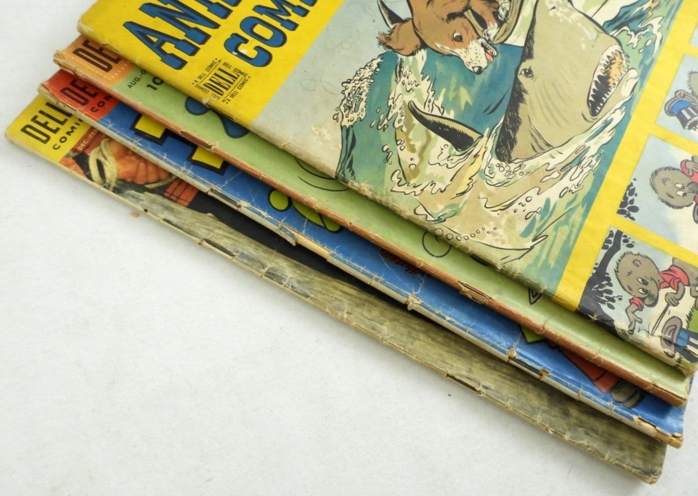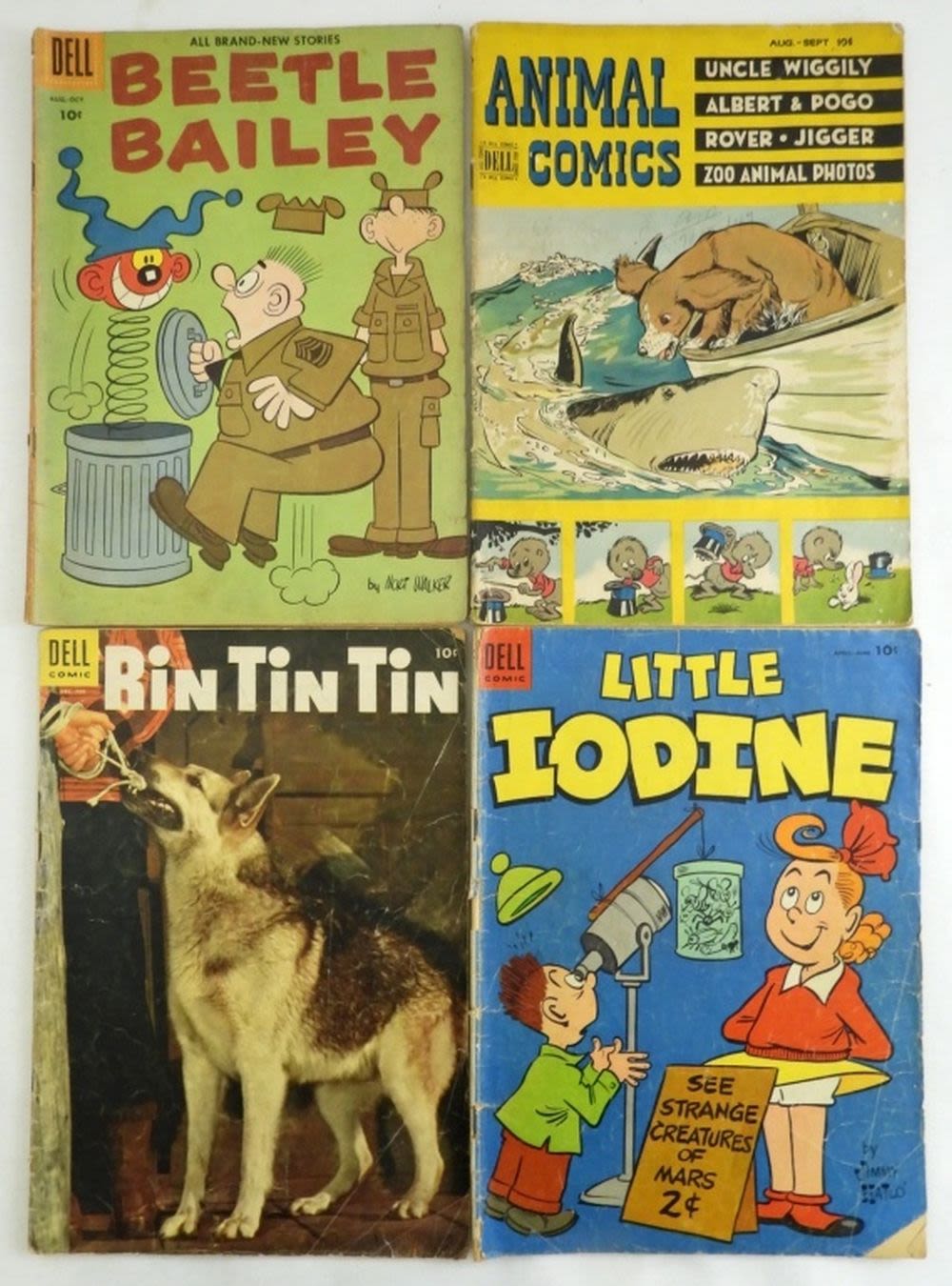 1947 Animal Comics #28, 1955 Rin Tin Tin #7, 1955 Little Iodine #28, 1957 Beetle Bailey #11; Good/Fair Conditions.