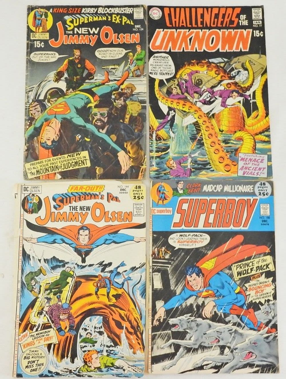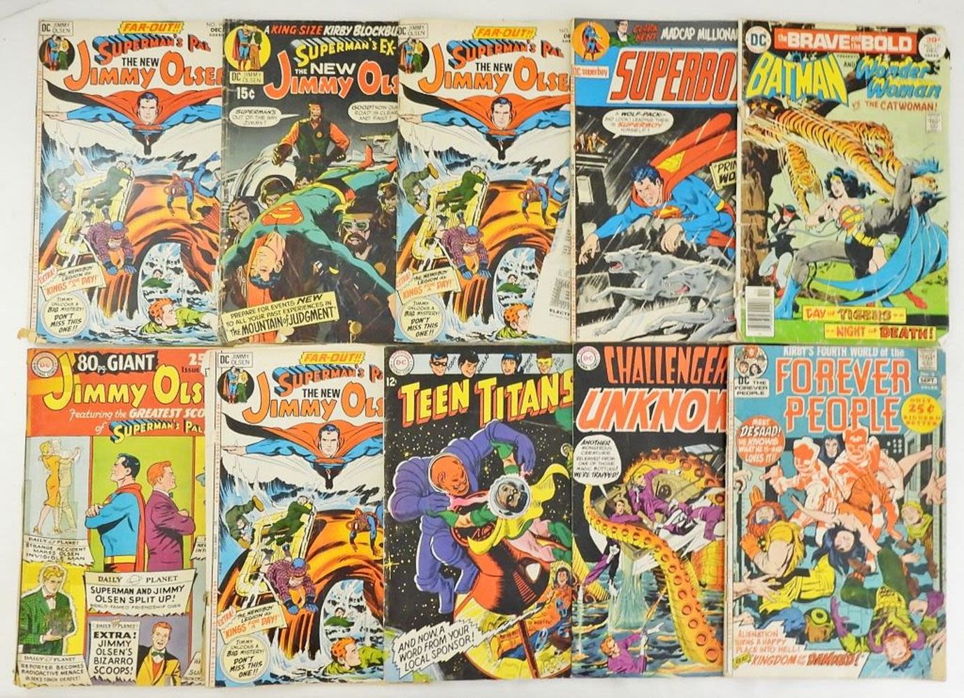 1967 TEEN TITANS #12 GOOD, 1970 #77 UNKOWN VG, 1971 FOREVER PEOPLE #4 GOOD plus (5) JIMMY OLSEN & SUPERMAN LESSER CONDITION LOT & (2) THROW IN POOR
