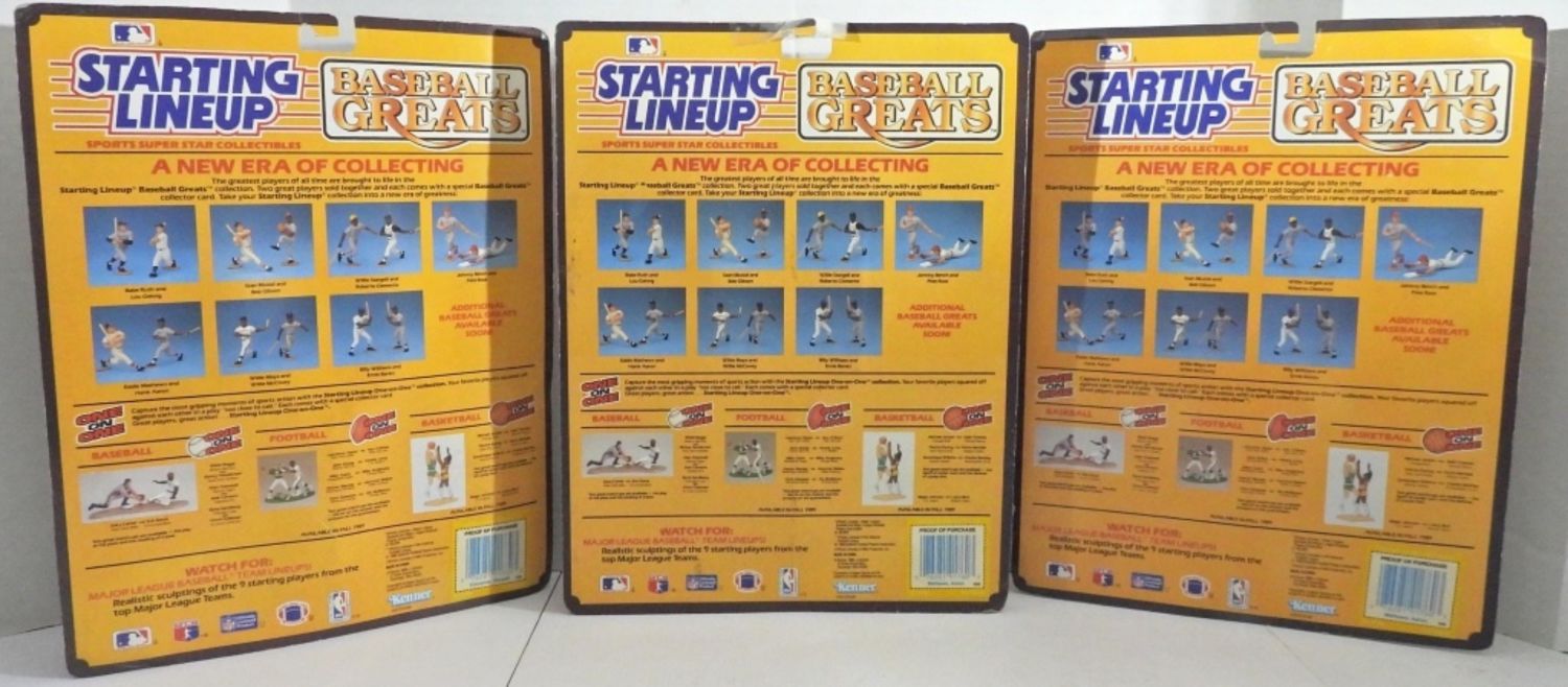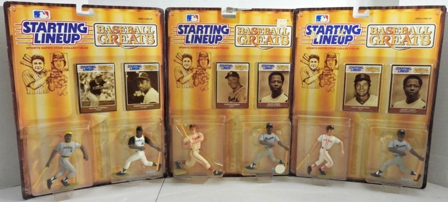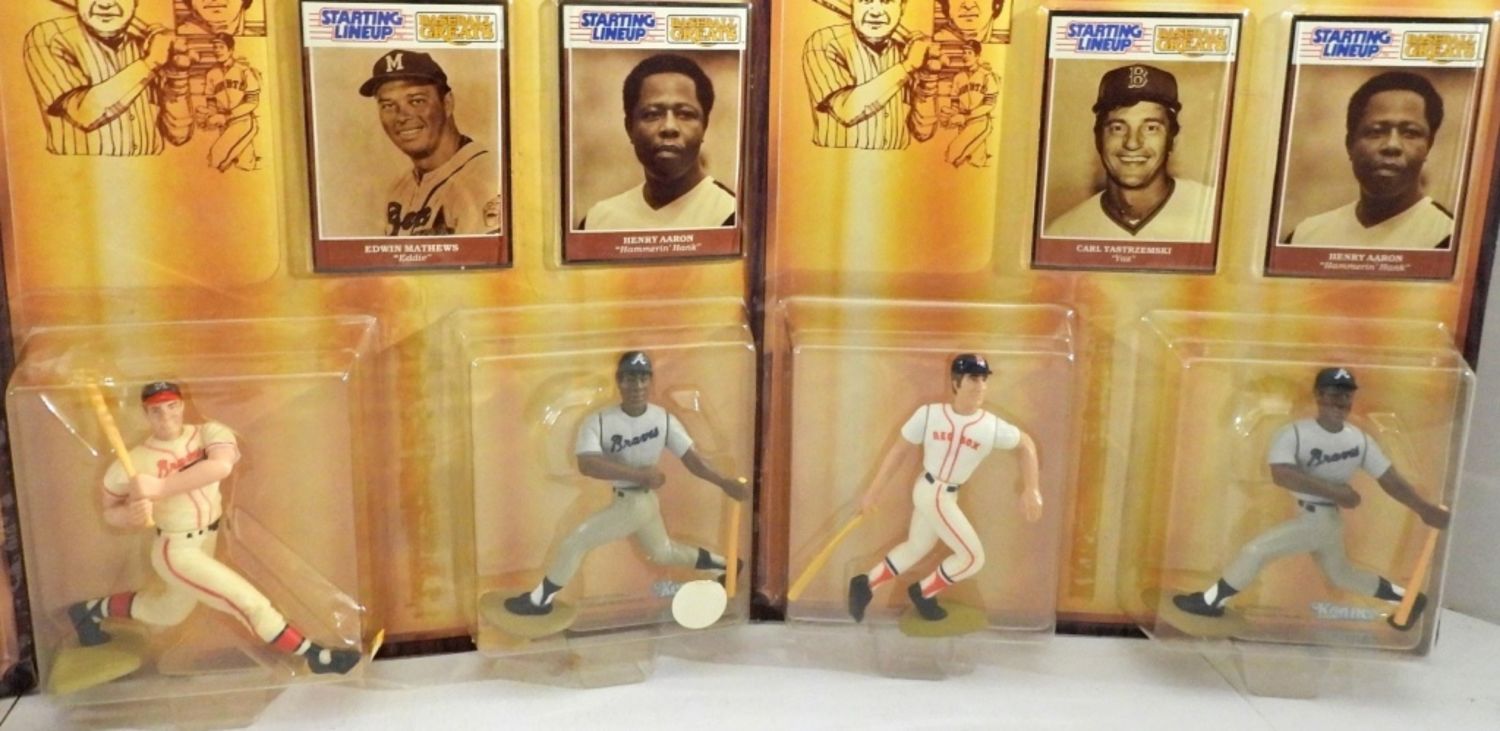 MADE BY KENNER, NORMAL WEAR AND TEAR ON PACKAGING, 1- EDWIN MATHEWS “EDDIE” AND HENRY AARON “HAMMERIN HANK” SEALED, 1- CARL YASTRZEMSKI “YAZ” HENRY AARON, 1- WILLE STARGELL “POPS” ROBERTO CLEMENTE “ARRIBA”