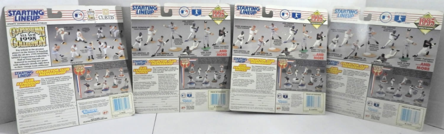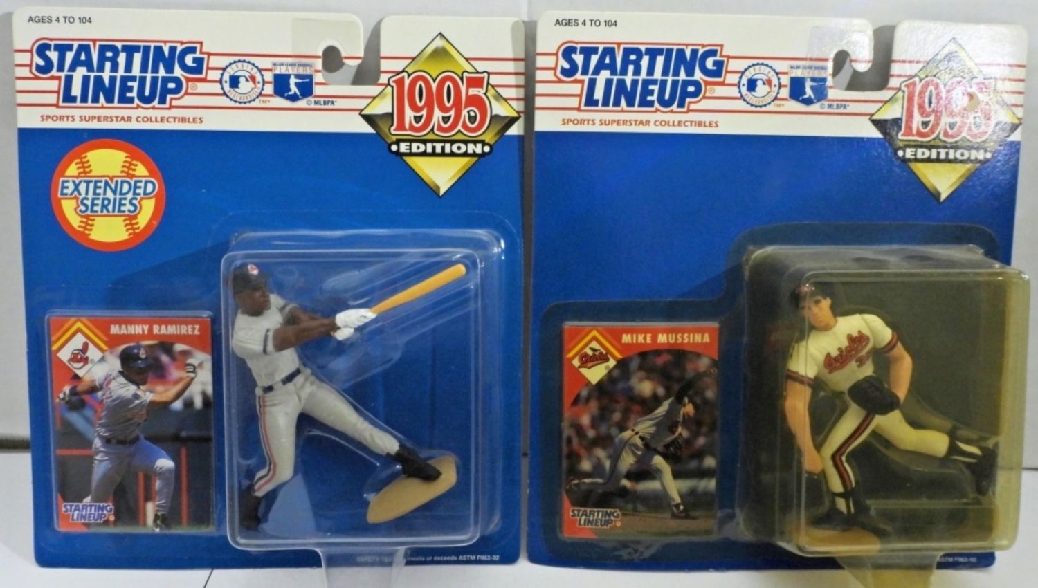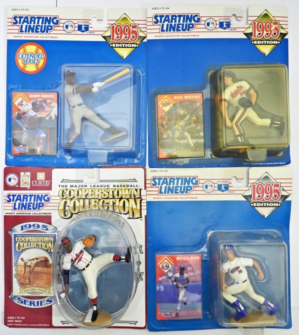 MADE BY KENNER, SEALED, NORMAL WEAR FROM THE YEARS, 1- COOPERSTOWN COLLECTION SERIES SATCHEL PAIGE, 3- 1995 EDITION MOISES ALOU, MIKE MUSSINA, MANNY RAMIREZ (EXTENDED SERIES)