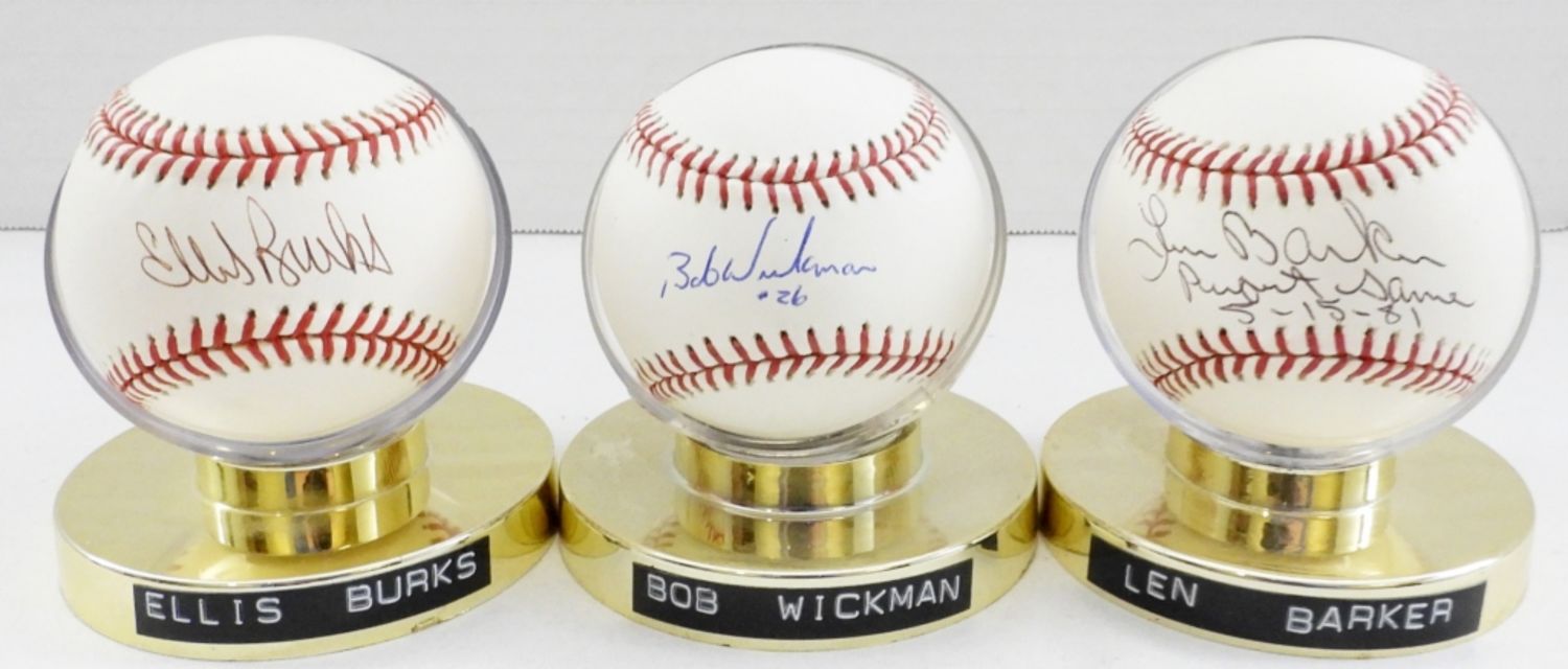 NO COA’S, SIGNED ON MAJOR LEAGUE BASEBALL, LEN BARKER, BOB WICKMAN, ELLIS BURKS
