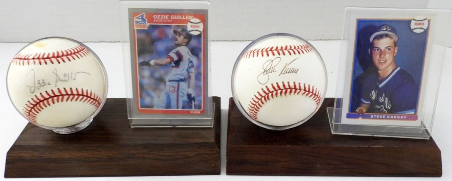 NO COA’S, BOTH SIGNED ON OFFICIAL AMERICAN LEAGUE BASEBALL, 1- OZZIE GUILLEN WITH BASEBALL CARD, 1- STEVEN KARSAY WITH BASEBALL CARD