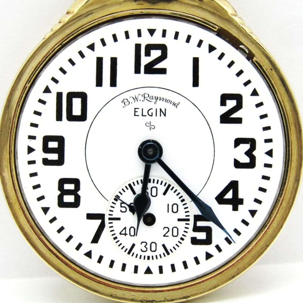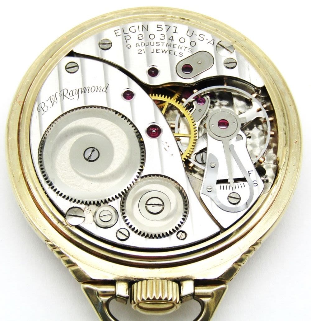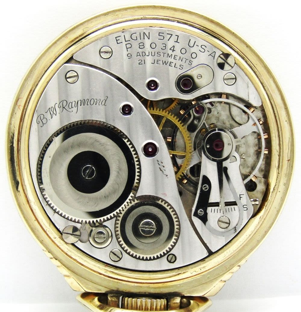 Nice Signed B.W. Raymond Porcelain Dial, 21 Jewel, Lever Set Grade 571 Movement, Elgin Signed Keystone Yellow Gold Filled Case.