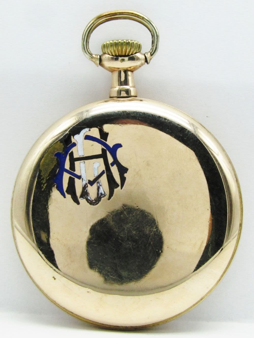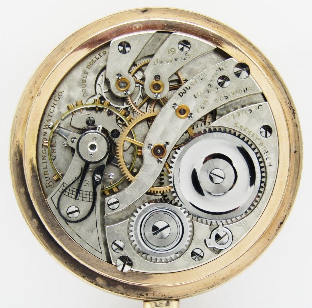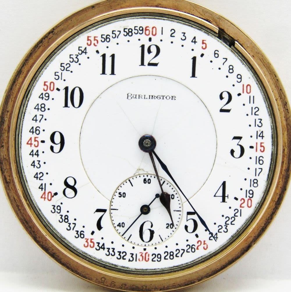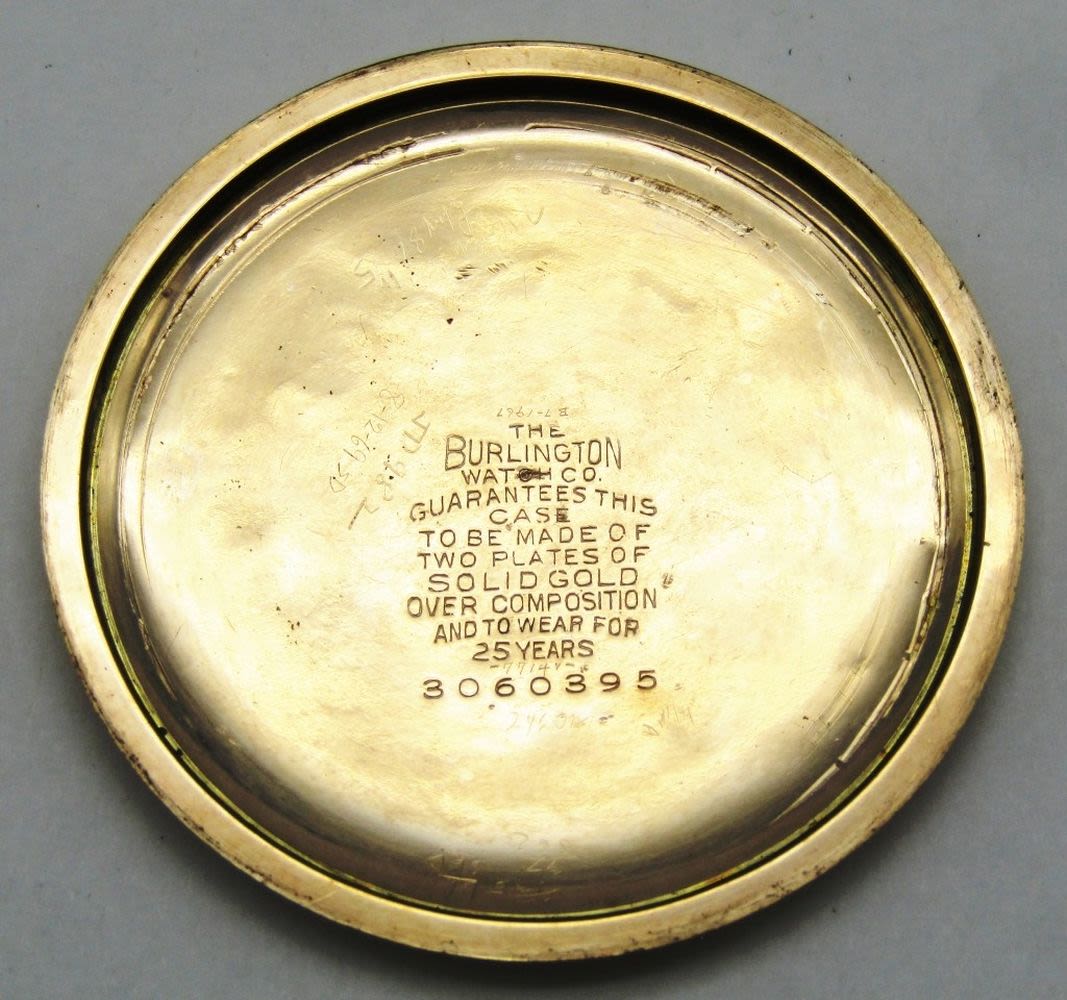 Double Sunk Porcelain Montgomery Dial, 19 Jewel, Lever Set Movement, Burlington Marked, Yellow Gold Filled Screwback Case with 3 Color Enamel Monogram.