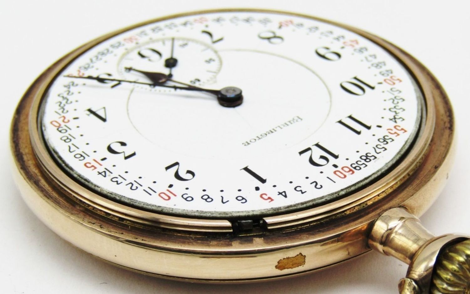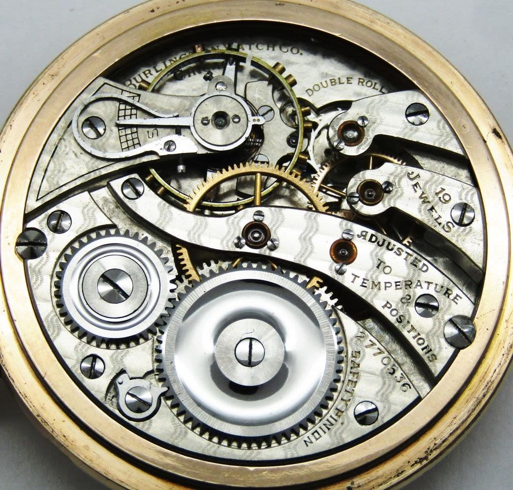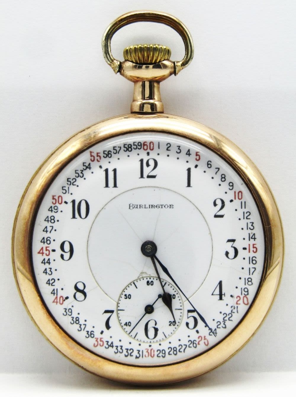Double Sunk Porcelain Montgomery Dial, 19 Jewel, Lever Set Movement, Burlington Marked, Yellow Gold Filled Screwback Case with 3 Color Enamel Monogram.