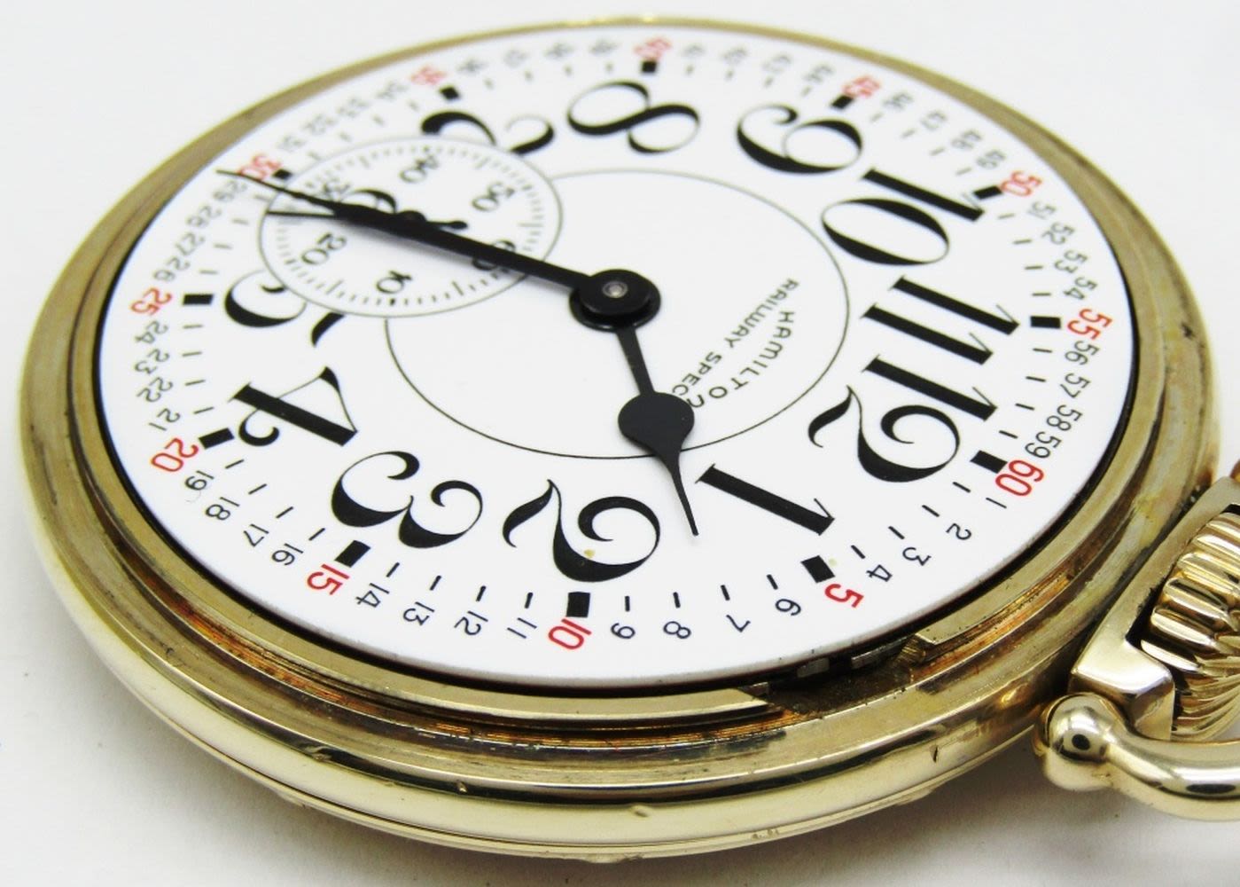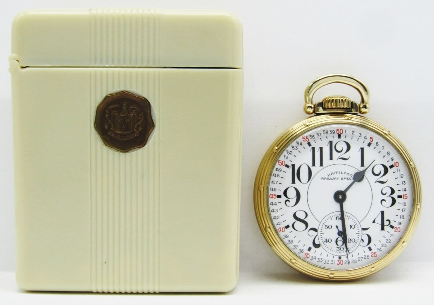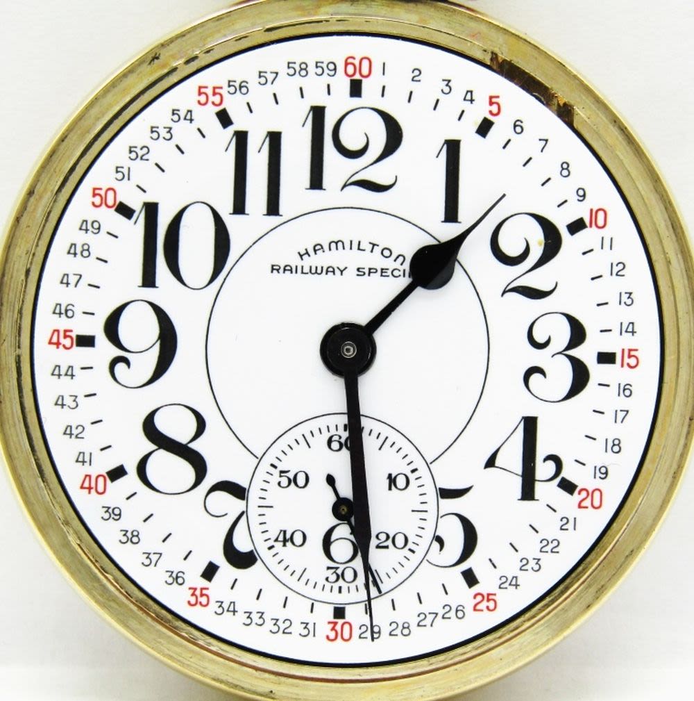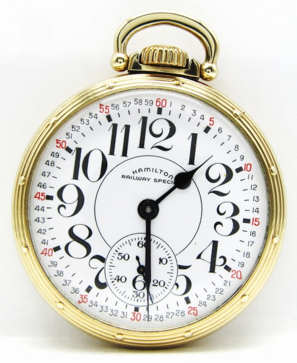 Perfect Montgomery Porcelain Dial Signed “Railway Special”, 21 Jewel Lever Set Movement, Hamilton Signed Yellow Gold Filled Model A Screwback Case. Complete with Original Hamilton Box, This is a nice watch!