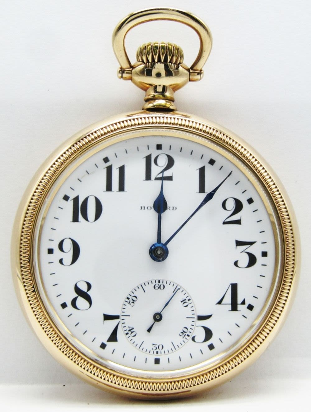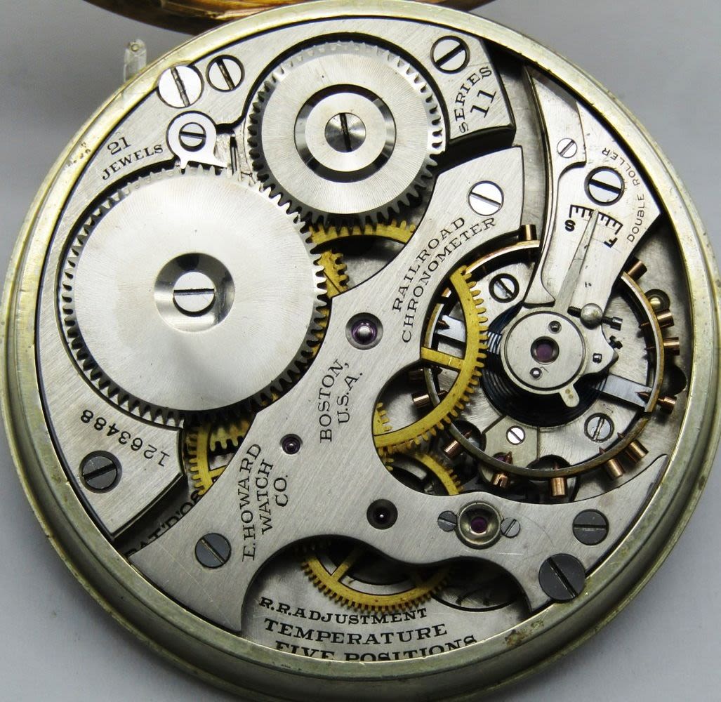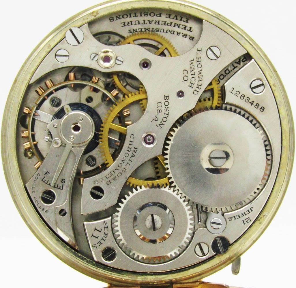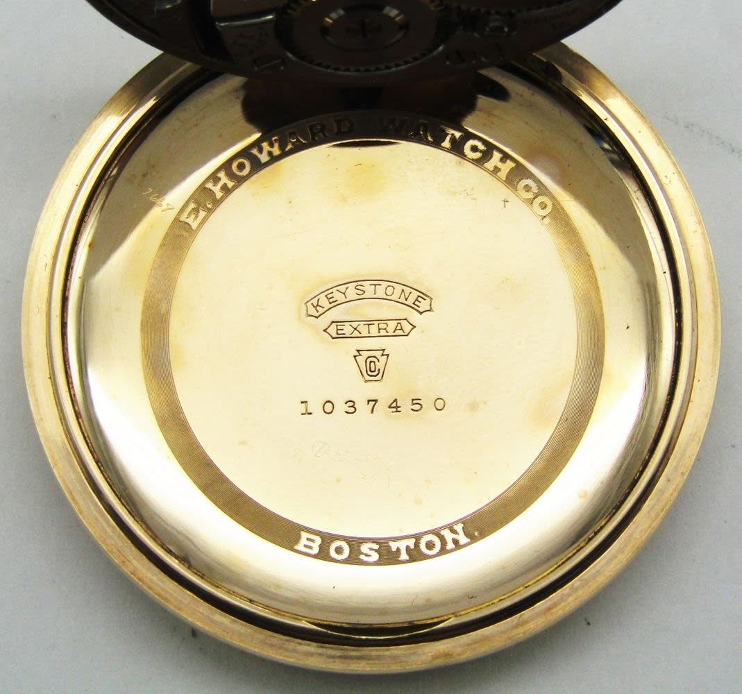 16S, 21 Jewel. Nice Single Sunk Porcelain Dial, 21 Jewel Lever Set Movement Marked “Railroad Chronometer”, E. Howard Marked Keystone Yellow Gold Filled Swing Out Case.