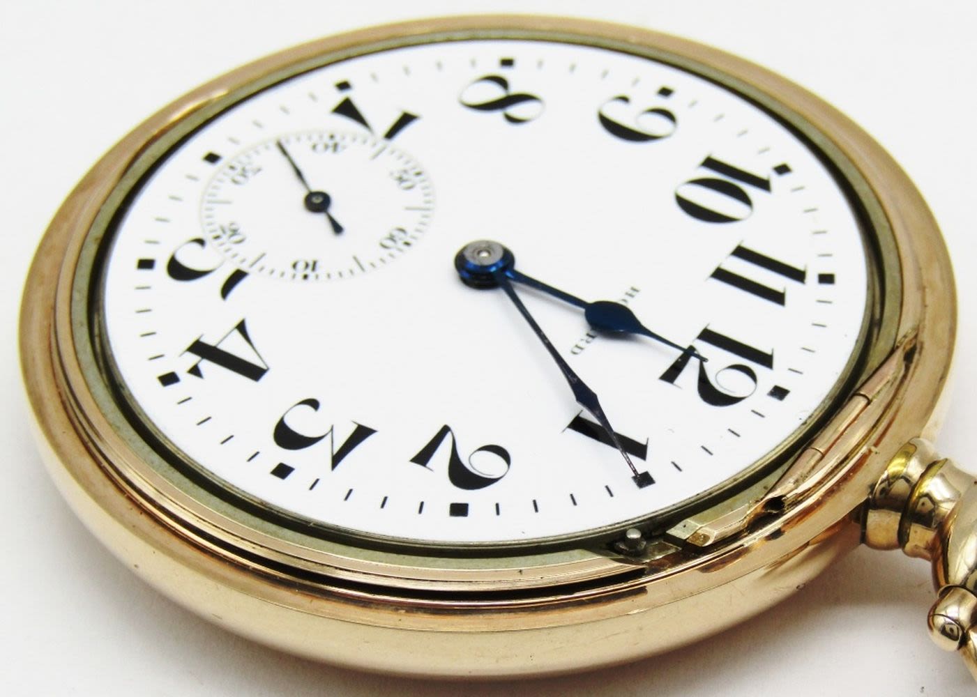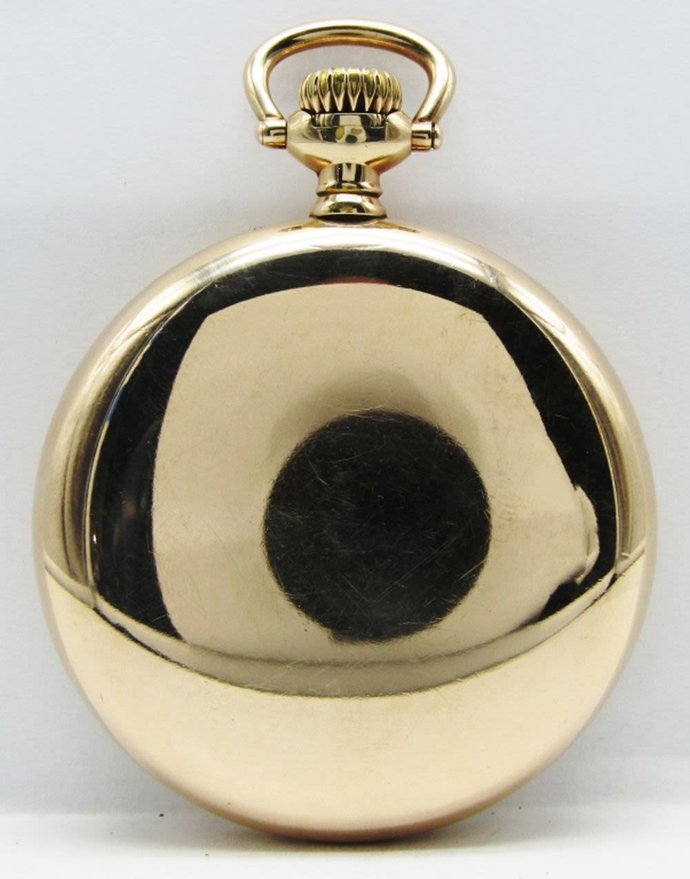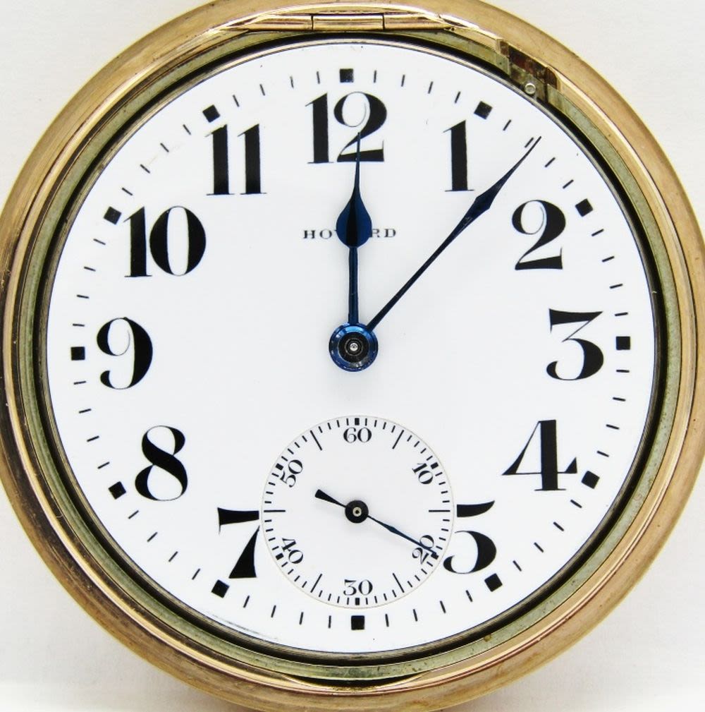 16S, 21 Jewel. Nice Single Sunk Porcelain Dial, 21 Jewel Lever Set Movement Marked “Railroad Chronometer”, E. Howard Marked Keystone Yellow Gold Filled Swing Out Case.