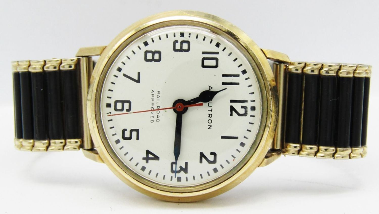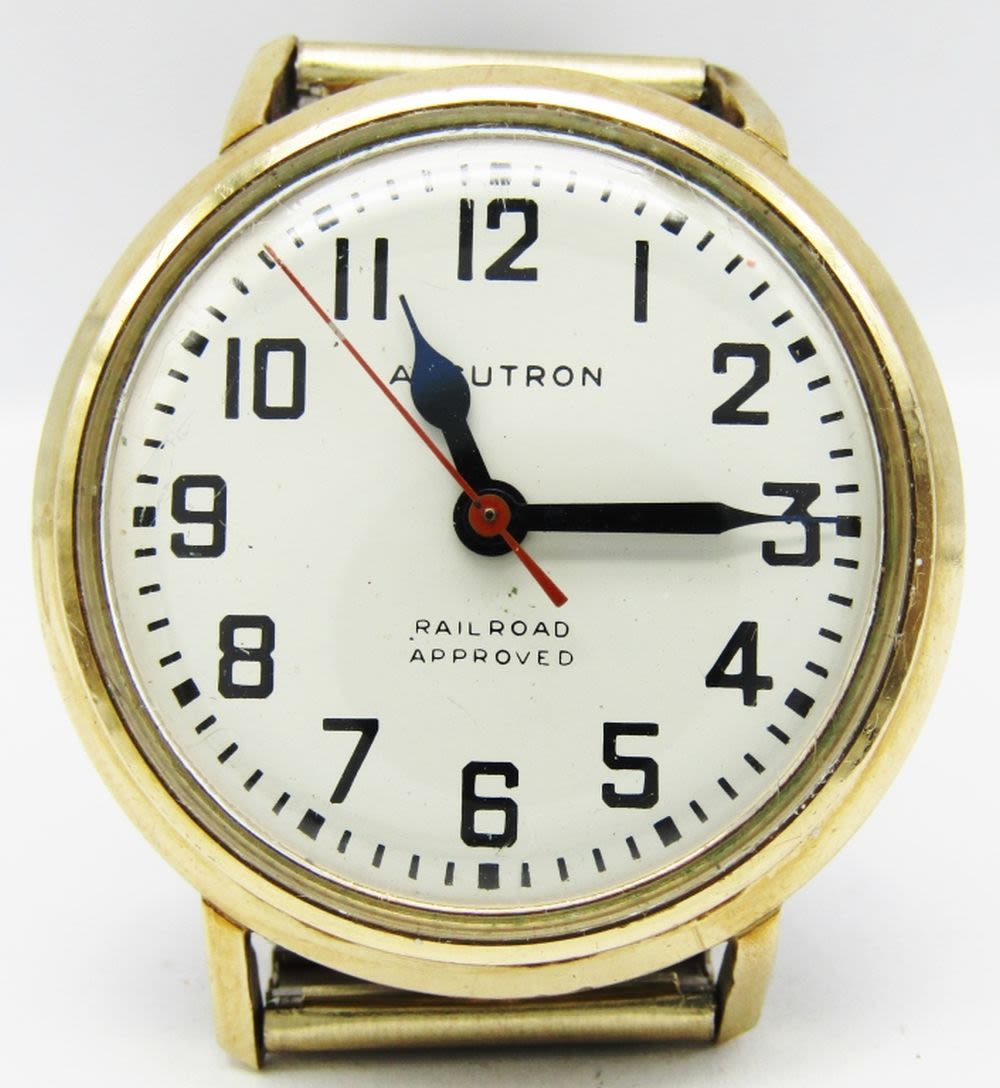 Excellent Original 24Hr, Railroad Dial, Gold Filled Case with Stainless Back, Case Date Code M4 = 1964, Fresh Battery, Vintage Stretch Band, 34mm.