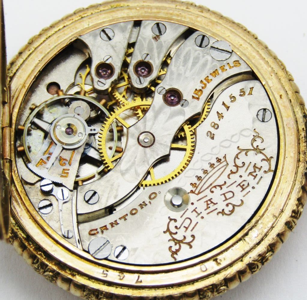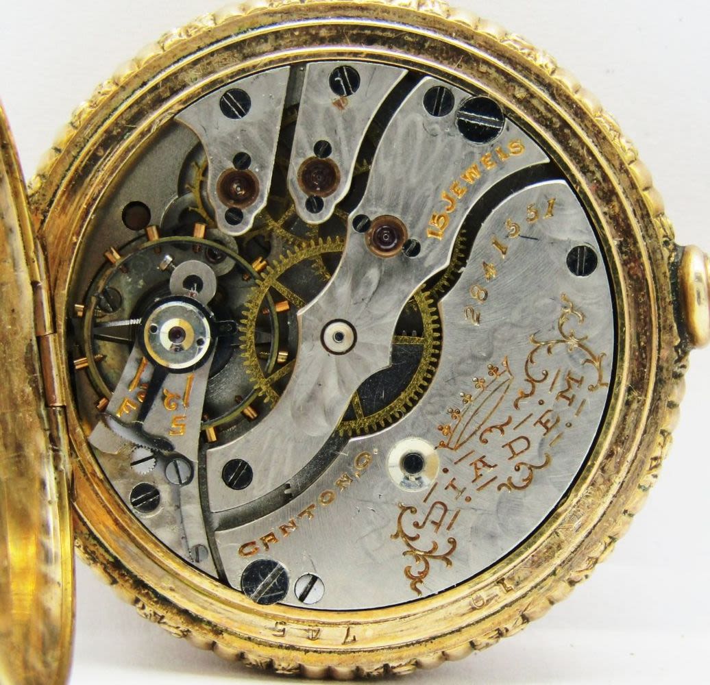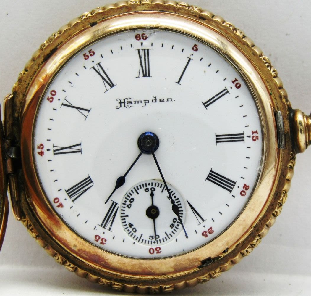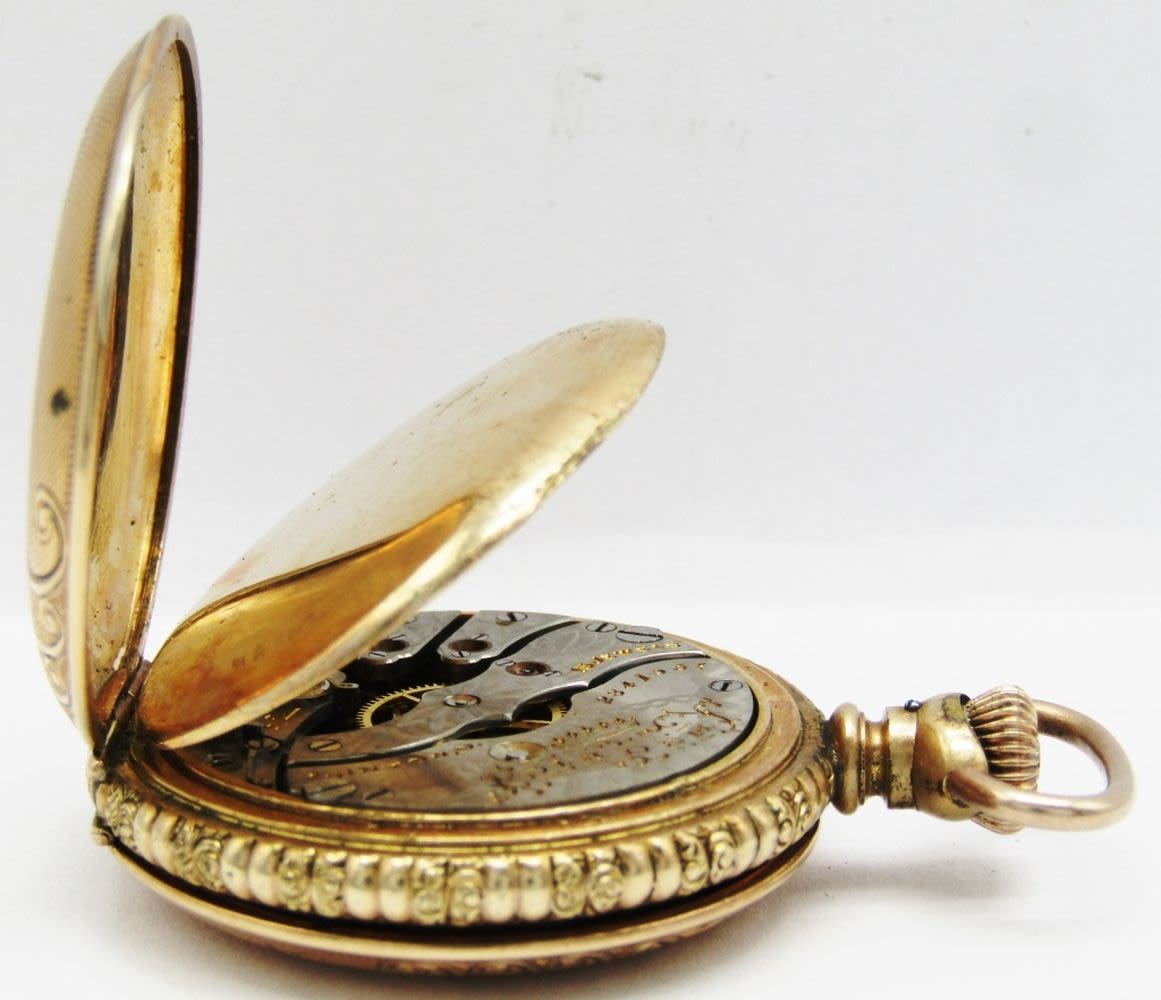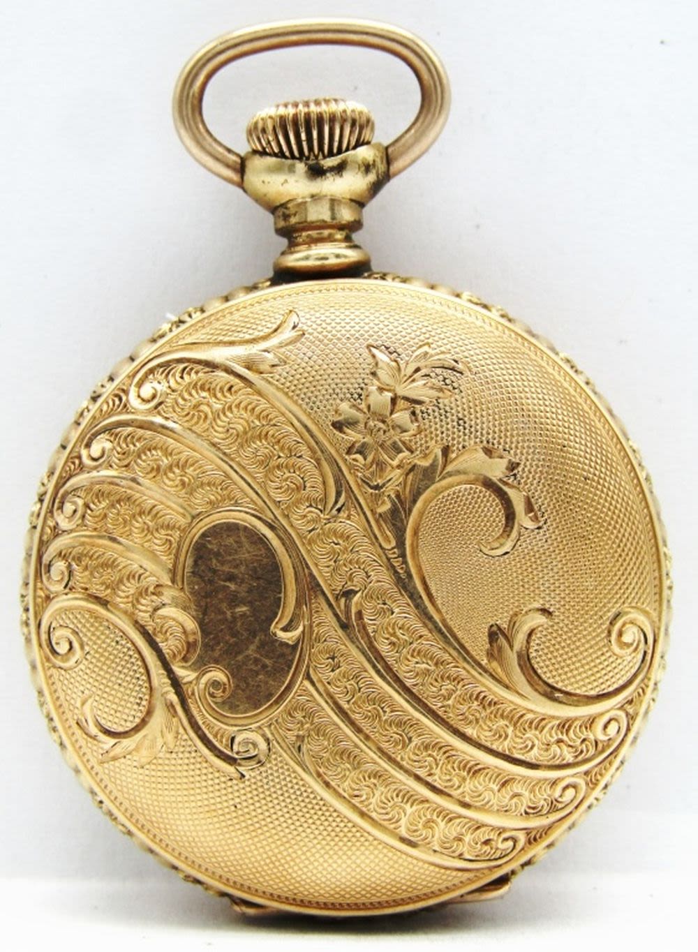 White Porcelain Dial, 15 Jewel Lever Set Movement, Dueber Yellow Gold Filled Hunting Case with Floral Motif, No Engraving!