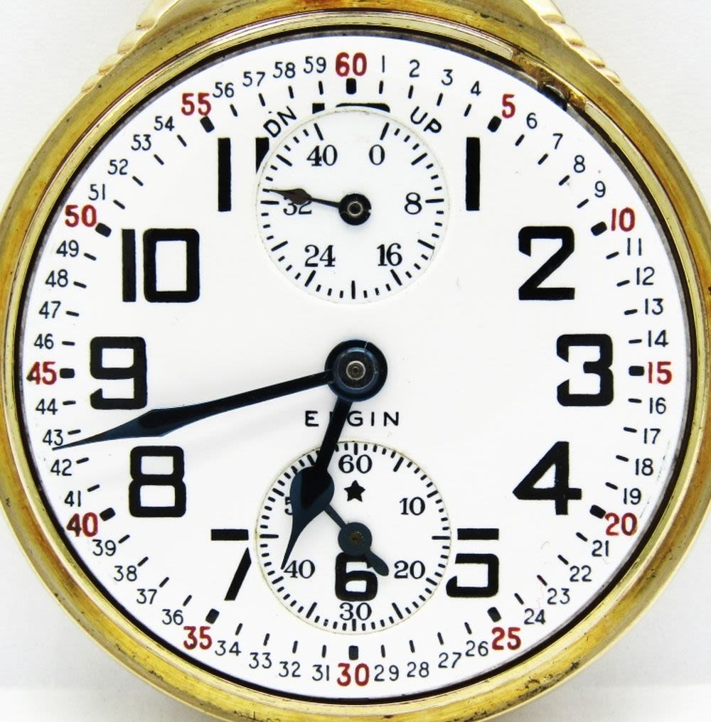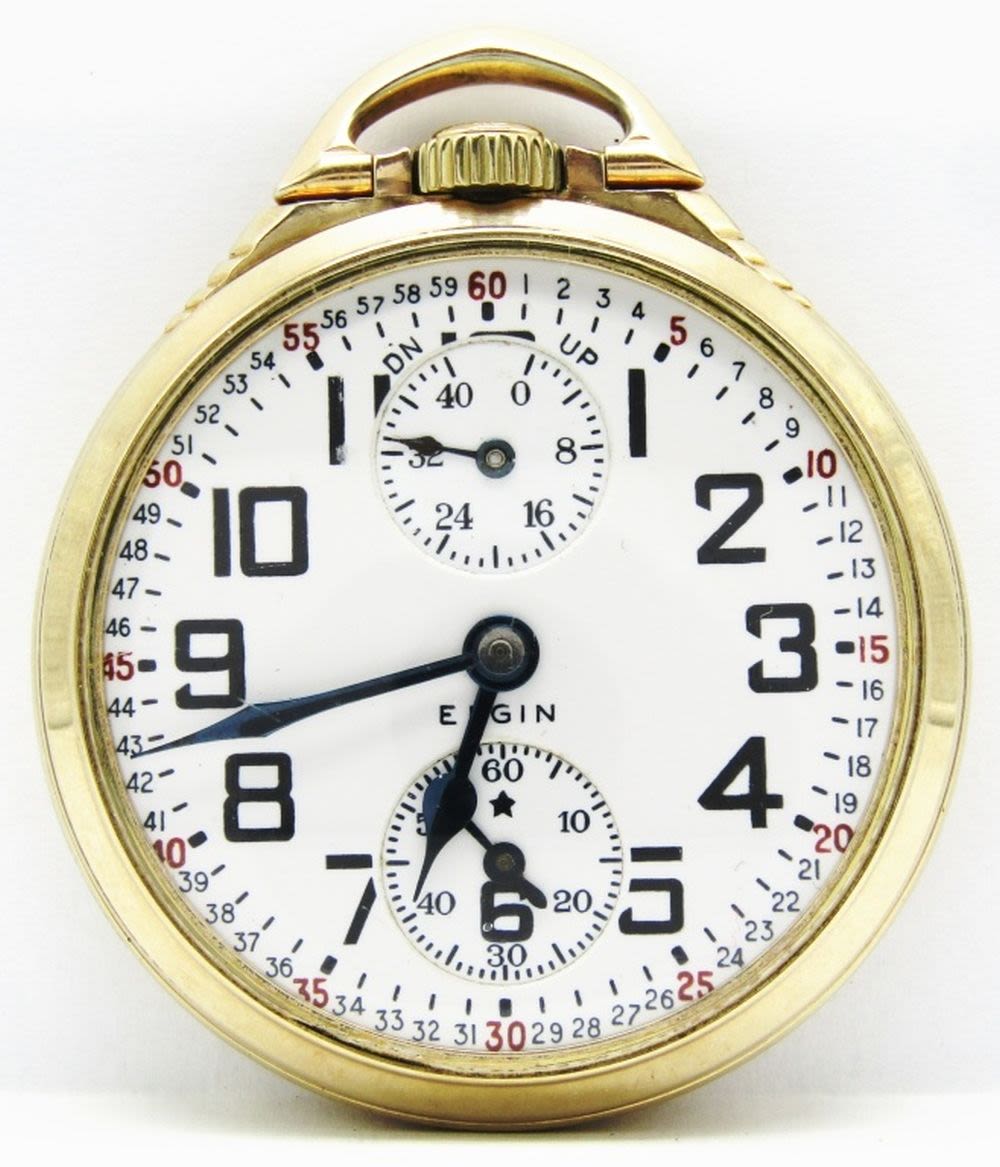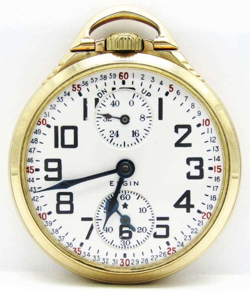 Perfect Porcelain Montgomery Dial, 23 Jewel Lever Set Movement with Wind Indicator Hand, Elgin Digned Yellow Gold Filled Keystone Case.