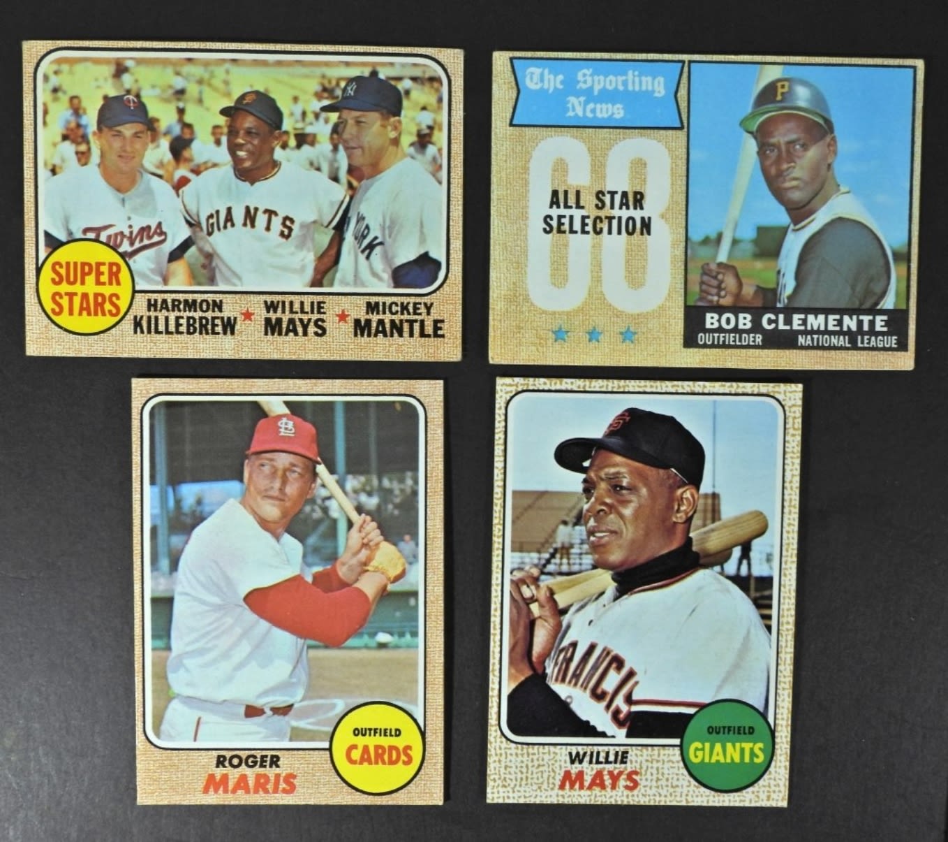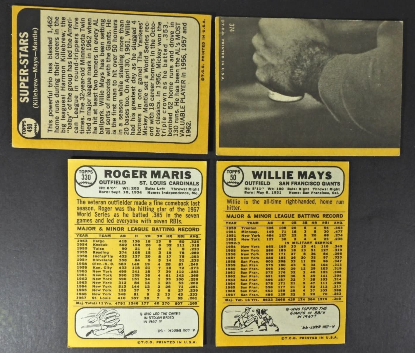 #50 MAYS EX+, #330 MARIS EX+, #374 CLEMENTE AS VGEX, #490 SUPER STARS KILL/MAYS/MANTLE VG++