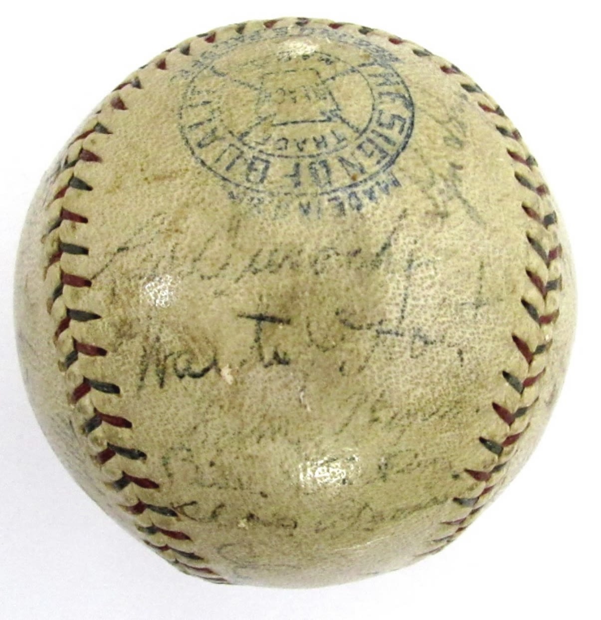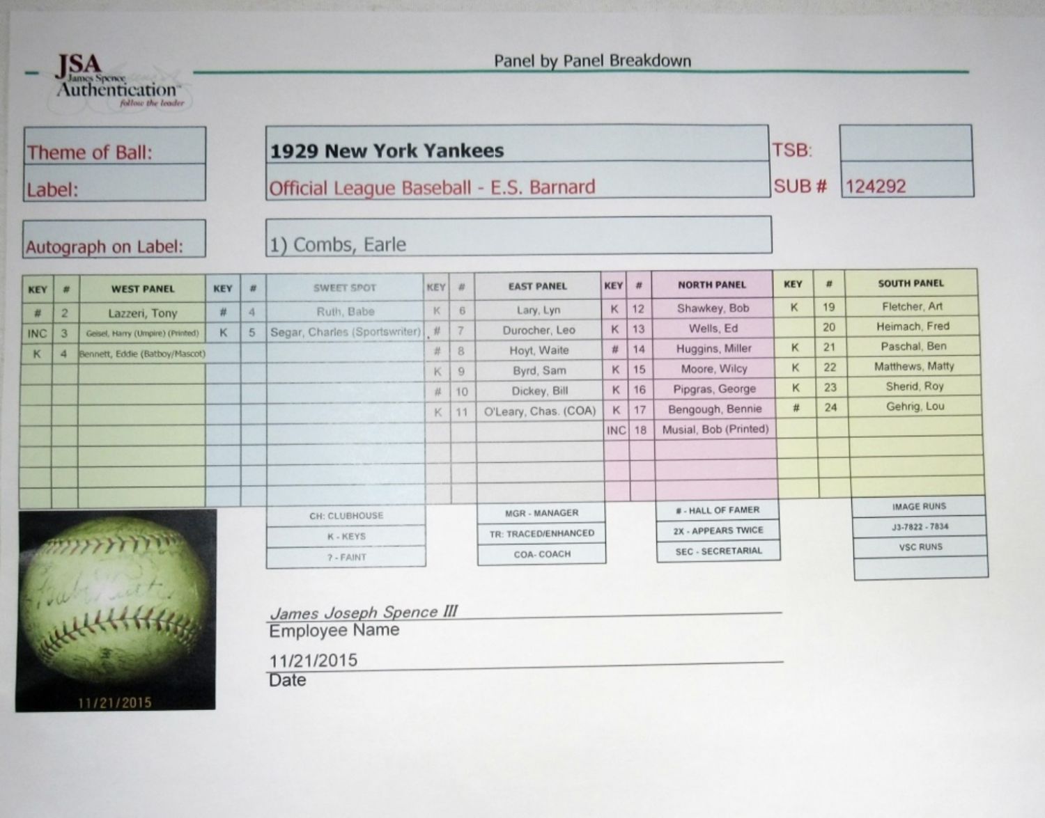1929 NEW YORK YANKEES TEAM SIGNED BASEBALL with BABE RUTH, LOU GEHRIG, EARLE COMBS, TONY LAZZERI, LEO DUROCHER, WAITE HOYT, BILL DICKEY, MILLER HUGGINS, A. FLETCHER, B.BENGOUGH, B.SHAWKEY, W.MOORE, C.EGAR, E.WELLS, E.BENNETT (BATBOY/MASCOT), R.SHERID, B.PASCHAL, L.LA;RY, C.O’LEARY, S.BYRD, G.PIPGRAS, M.MATHEWS, THE SIGNATURE OF HARRY GEISEL (UMPIRE) AND PRINTING OF “BOB MUSIAL” ON THE NORTH PANEL ARE DEEMED INCONCLUSIVE. –